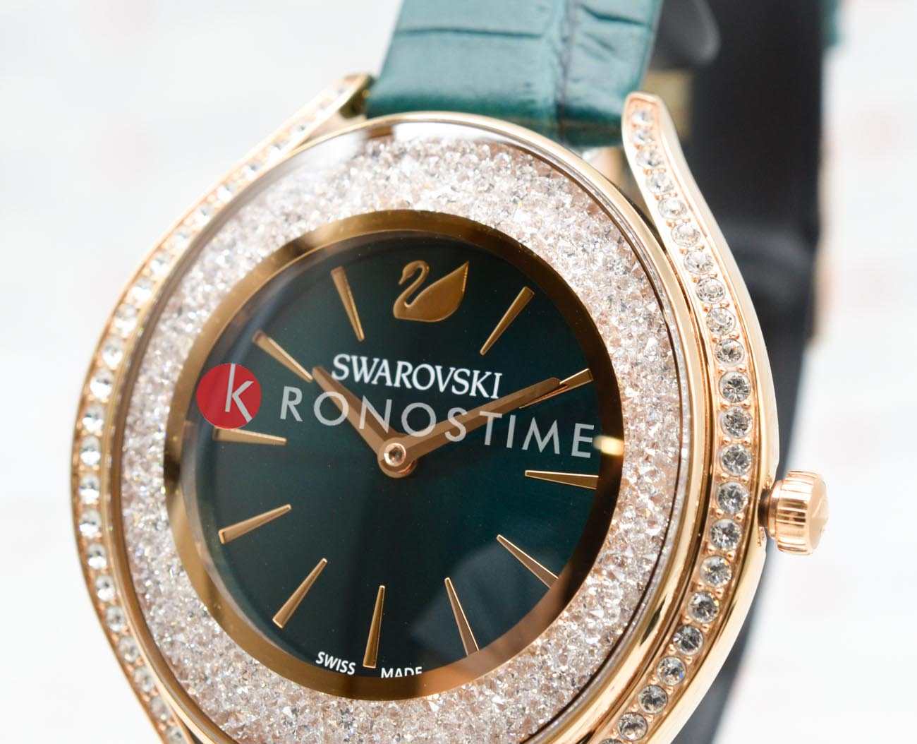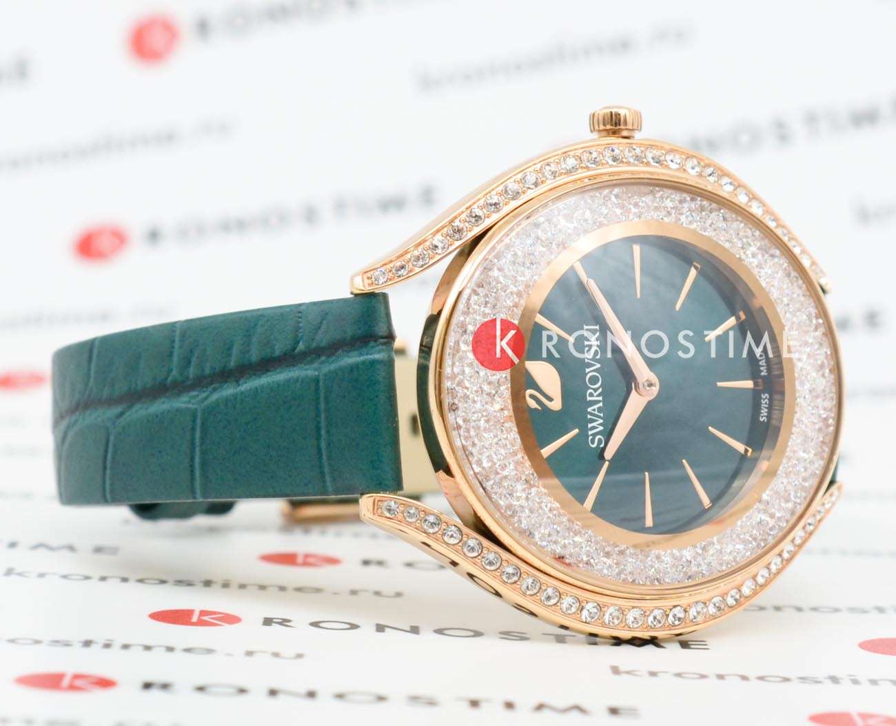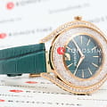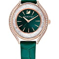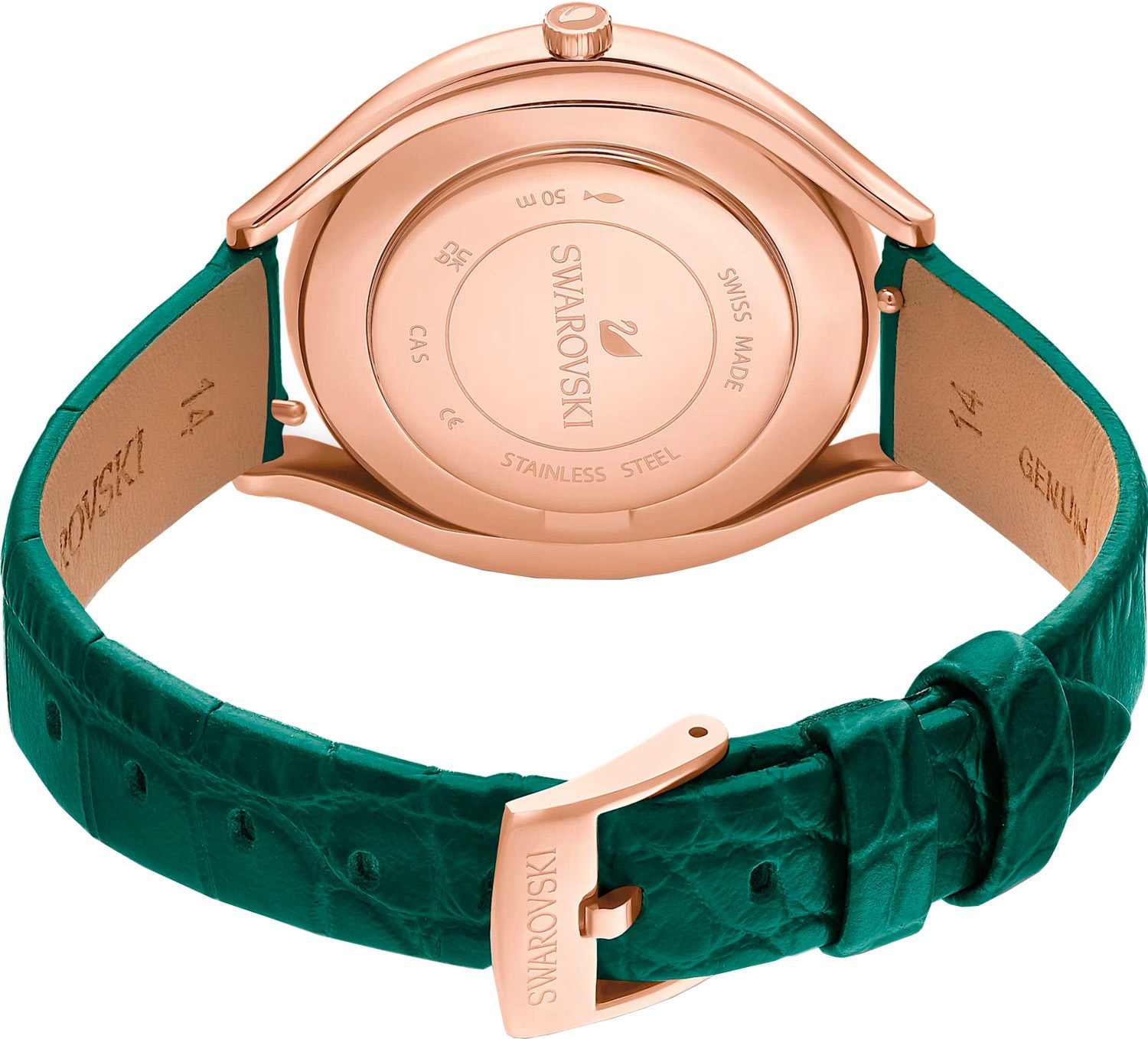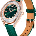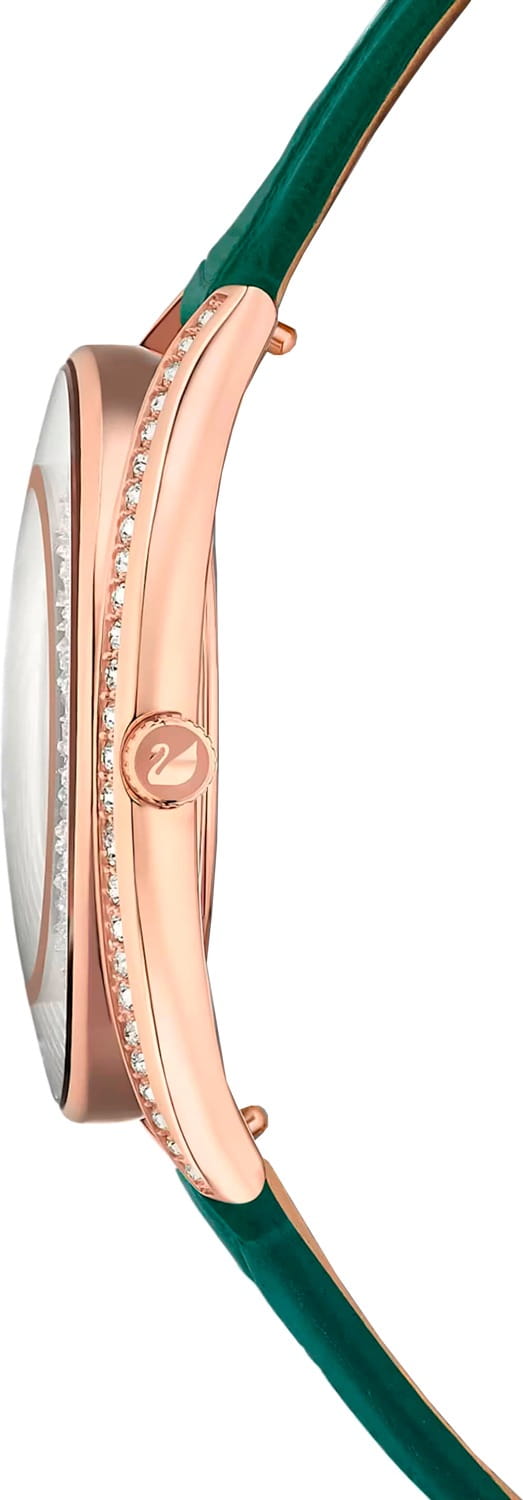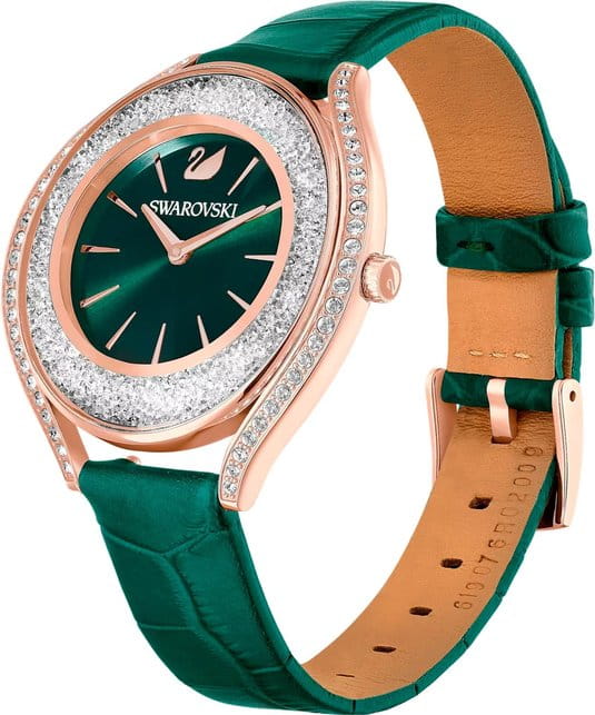 Swarovski 5644078 — элегантные женские часы из коллекции Crystalline Aura, сочетающие изысканный дизайн с высоким качеством. Корпус диаметром 35,5 мм выполнен из нержавеющей стали с розовым PVD-покрытиемPVDУльтратонкое покрытие наносится в технике вакуумного напыления, сочетает в себе нитрид титана особой прочности со слоем золота или оксида хрома. Несёт в себе декоративную или защитную функцию., что обеспечивает долговечность и элегантный вид. Минеральное стеклоМинеральное стеклоМинеральное стекло представляет собой искусственно выращенный минерал кварца. Такое стекло отличается особой устойчивостью к повреждениям и царапинам. Уступает по некоторым качествам сапфировому стеклу. защищает циферблат от царапин. Корпус украшен более чем 1300 кристаллами Swarovski, создающими роскошный блеск. Зеленый циферблат с изящными золотистыми метками и стрелками подчёркивает утончённость дизайна. Логотип Swarovski в виде лебедя расположен на отметке «12 часов». Часы оснащены швейцарским кварцевым механизмом, обеспечивающим точный ход. Ремешок из итальянской телячьей кожи зеленого цвета гарантирует комфортное ношение. Классическая застёжка обеспечивает надёжную фиксацию. Водозащита до 5 ATM (50 метров) делает часы подходящими для повседневного использования. Swarovski 5644078 — это идеальный выбор для женщин, ценящих утончённый стиль, функциональность и комфорт.