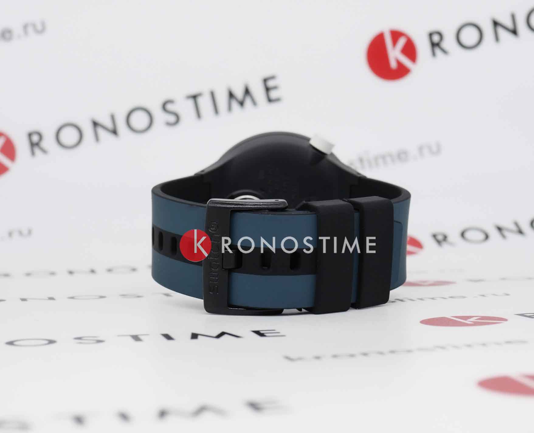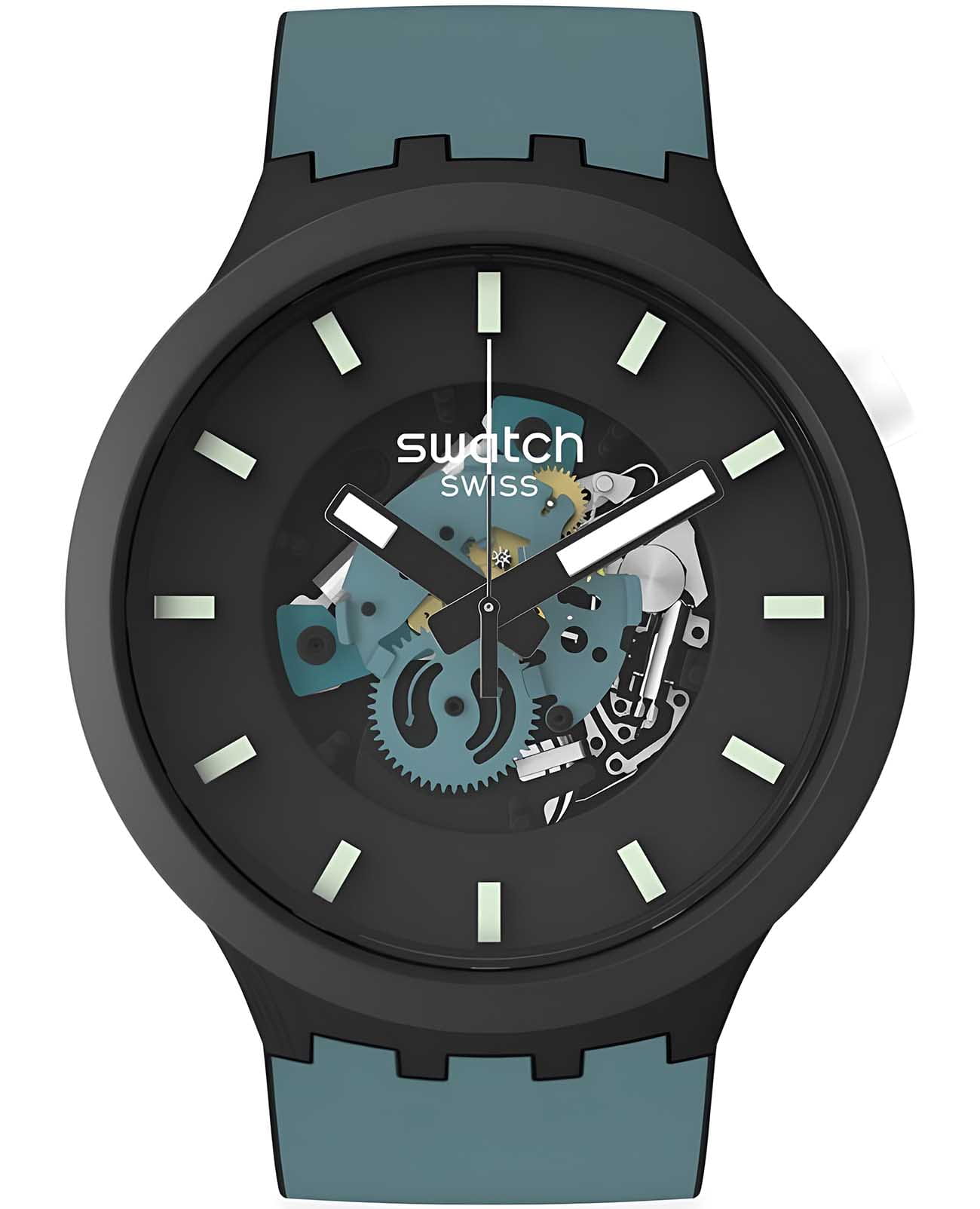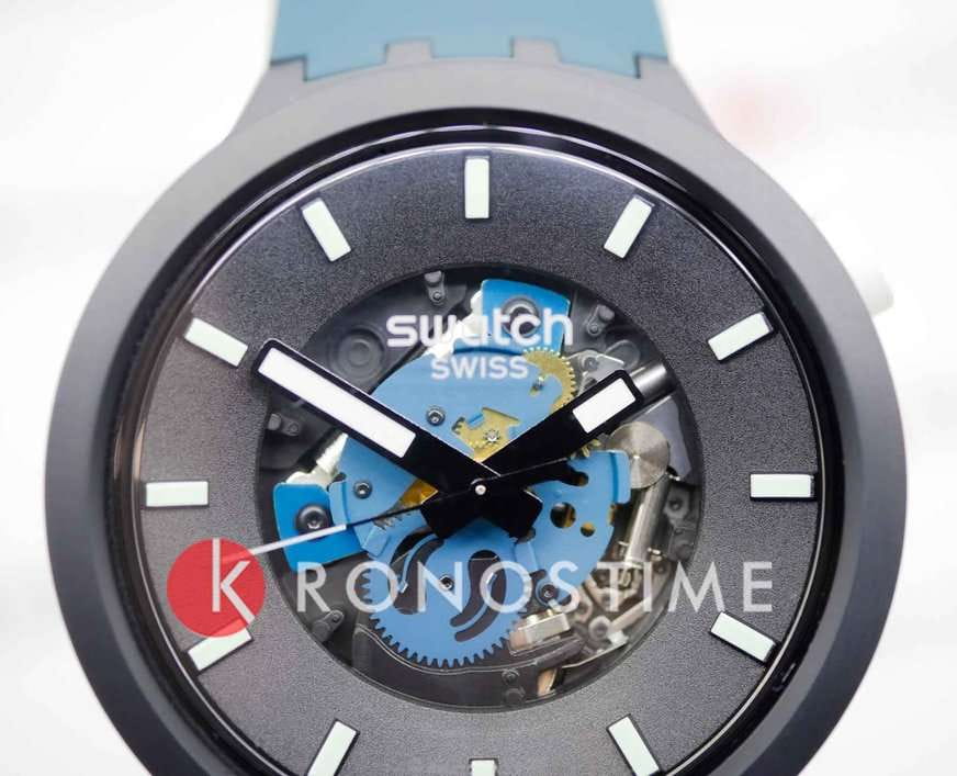 Часы Swatch SB03B107 — это стильный и современный аксессуар для тех, кто ценит лёгкость и комфорт. Часы идеально подойдут как для мужчин, так и для женщин. Центральный элемент этой модели часов — большой корпус со стеклом из био-материала, украшенный 3D-циферблатом с принтами на индексах. Корпус из биокерамикиБиокерамикаБиокерамика — это материал, который на две трети состоит из керамики, на одну треть — из биопластика. Он сочетает в себе лучшие качества обоих материалов и обладает прочностью и шелковистой на ощупь текстурой., а также силиконовые тренчики подчеркивают темно-синий принт на силиконовом ремешке этих огромных часов. На часовую, минутную стрелки нанесено люминесцентное покрытиеЛюминесцентное покрытиеПозволяет считывать показания времени в темноте. Производители наносят на стрелки, часовые индексы, безель или поверхность циферблата светонакопительный состав, дающий холодное свечение., которое светится в темноте, создавая необычное изображение. Водозащита 30 метров делает часы практичными для повседневного использования. Эти часы подойдут для повседневного ношения и станут ярким акцентом в вашем наряде.