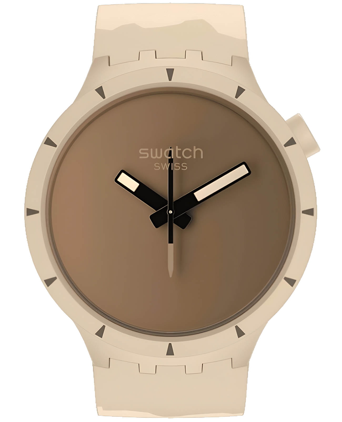 Часы Swatch SB03C101 — это стильный и современный аксессуар для тех, кто ценит лёгкость и комфорт. Часы идеально подойдут как для мужчин, так и для женщин. Корпус из биокерамикиБиокерамикаБиокерамика — это материал, который на две трети состоит из керамики, на одну треть — из биопластика. Он сочетает в себе лучшие качества обоих материалов и обладает прочностью и шелковистой на ощупь текстурой., а ремешок — из однотонного матово-бежевого силикона. Коричневый циферблат подчеркивает белые акценты на темных стрелках. Секундная стрелка, прообразом которой стала стрелка компаса, усиливает дух приключений. На часовую и минутную стрелки нанесено люминесцентное покрытиеЛюминесцентное покрытиеПозволяет считывать показания времени в темноте. Производители наносят на стрелки, часовые индексы, безель или поверхность циферблата светонакопительный состав, дающий холодное свечение., которое светится в темноте, создавая необычное изображение. Водозащита 30 метров делает часы практичными для повседневного использования. Эти часы подойдут для повседневного ношения и станут ярким акцентом в вашем наряде.