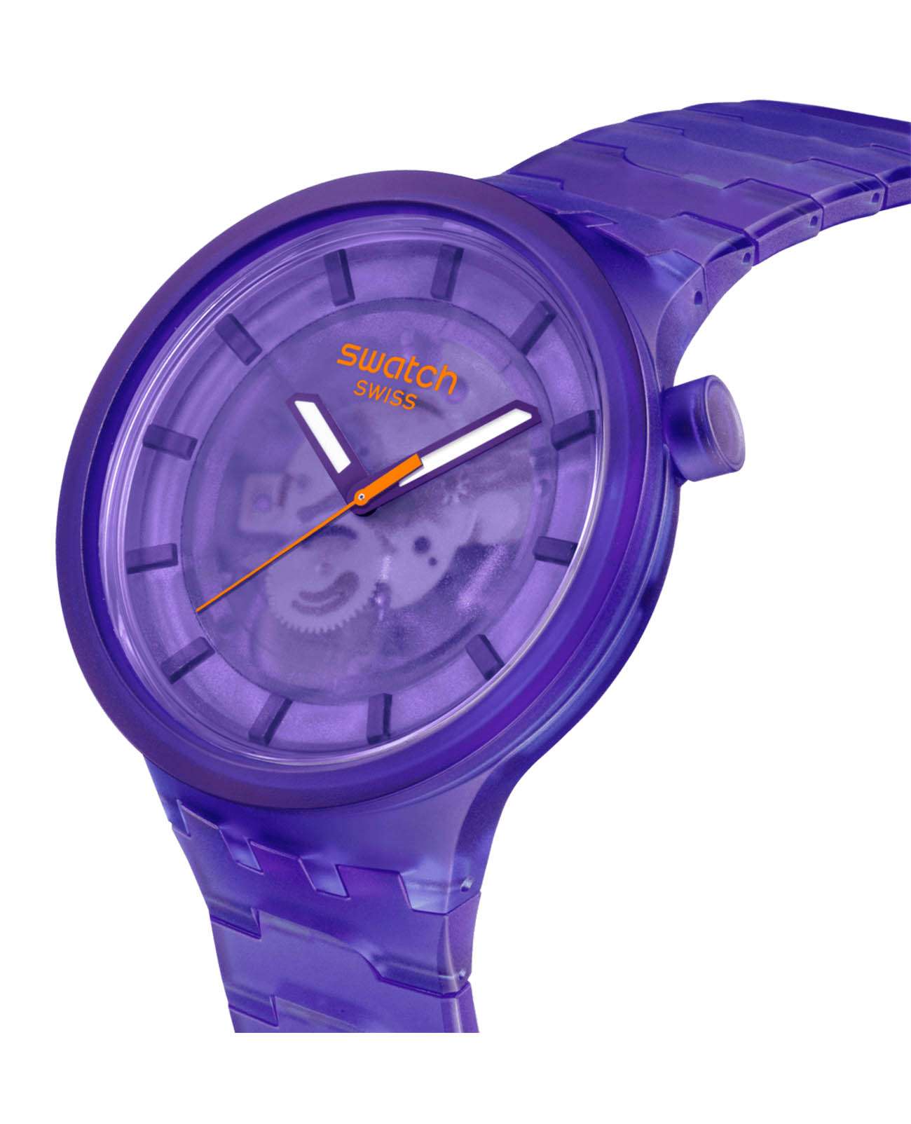 Часы Swatch SB05V103 — это стильный и современный аксессуар для тех, кто ценит лёгкость и комфорт. Часы идеально подойдут как для мужчин, так и для женщин. Эти большие часы фиолетового цвета могут похвастаться прозрачным корпусом и циферблатом фиолетового оттенка, изготовленными из биосодержащих материалов, и браслетом с застежкой-бабочкойЗастёжка "бабочка"Такой вид застёжки дополняется предохранителями, помогающими избежать случайного раскрытия браслета. Обладают изящным исполнением. . Прозрачный фиолетовый циферблат с биологическим покрытием позволяет видеть механизм, а на часовую и минутную стрелки нанесено люминесцентное покрытиеЛюминесцентное покрытиеПозволяет считывать показания времени в темноте. Производители наносят на стрелки, часовые индексы, безель или поверхность циферблата светонакопительный состав, дающий холодное свечение., которое светится в темноте, создавая необычное изображение. Водозащита 30 метров делает часы практичными для повседневного использования. Эти часы подойдут для повседневного ношения и станут ярким акцентом в вашем наряде.
