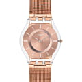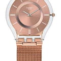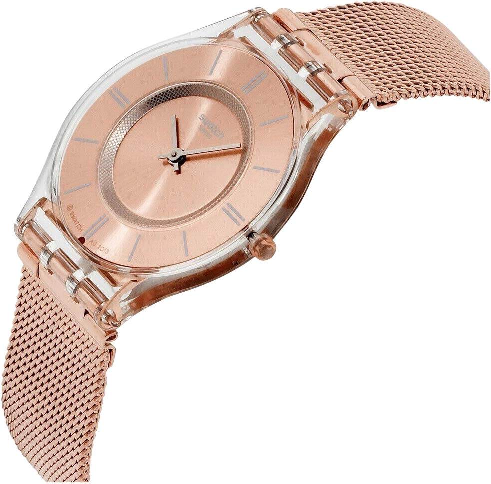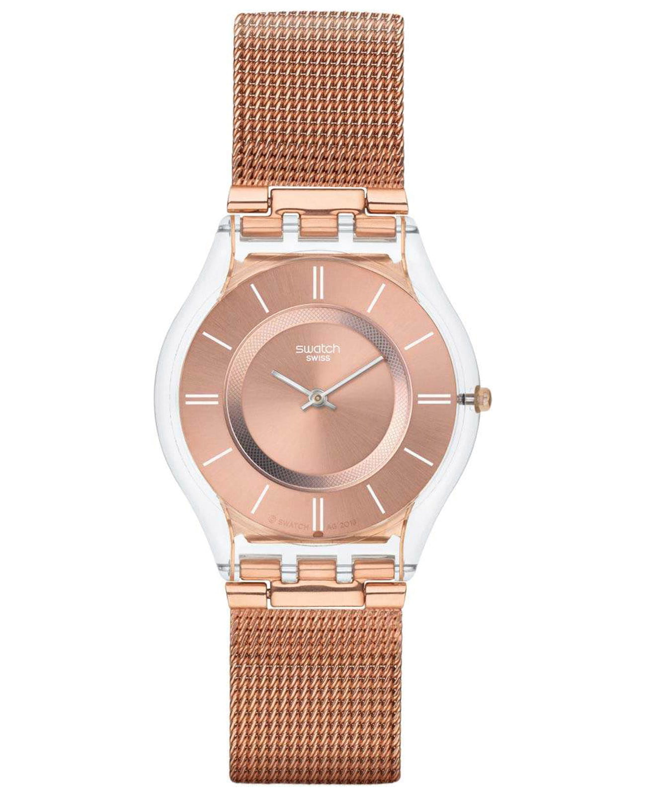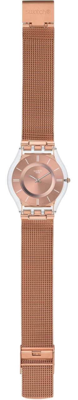 Швейцарские наручные часы Swatch SFP115M. Эти современные и легкие женские часы относятся к коллекции Skin, изготовлены из сверхтонкого и точного кварца швейцарского производства. Ультратонкие, толщина 3.9 мм, диаметр корпуса 34 мм. С водозащитой до 30 метров они надежно защищают корпус от случайных брызг и капель дождя. Многослойное акриловое стекло, используемое в этих часах, обладает высокой прочностью и трудно разбивается; это легкий прозрачный пластик, который может прогибаться при ударах и не разлетается на осколки. Кроме того, акрил устойчив к перепадам температуры и высокому давлению. Корпус часов выполнен из полимера, а механизм — кварцевый. Кварцевые часы обеспечивают большую точность по сравнению с механическими, с погрешностью хода около 20 секунд в месяц. Они не требуют завода, достаточно менять батарейку раз в несколько лет. Стальной браслет с PVD-покрытиемPVDУльтратонкое покрытие наносится в технике вакуумного напыления, сочетает в себе нитрид титана особой прочности со слоем золота или оксида хрома. Несёт в себе декоративную или защитную функцию. миланского плетения на застежке "раскладной замок", позволяющей легко регулировать браслет по длине.