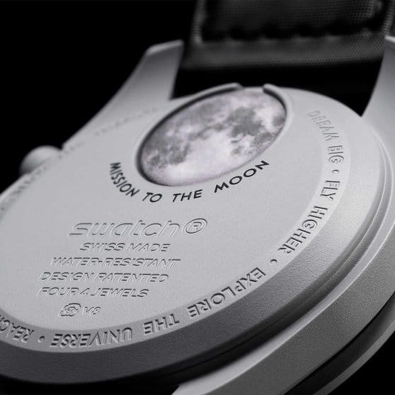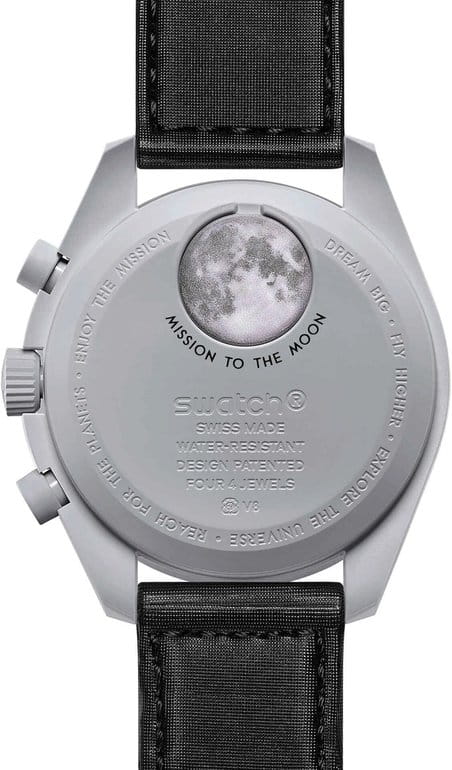 Часы Swatch Bioceramic Moonswatch MISSION TO THE MOON SO33M100 — это стильный и современный аксессуар для тех, кто ценит лёгкость и комфорт. Корпус диаметром 42 мм и пряжка этих уникальных часов изготовлены из биокерамикиБиокерамикаБиокерамика — это материал, который на две трети состоит из керамики, на одну треть — из биопластика. Он сочетает в себе лучшие качества обоих материалов и обладает прочностью и шелковистой на ощупь текстурой., а также ремешок VELCRO®. Модель оснащена черным циферблатом и черным биокерамическим безелемБезельВнешний ободок, закрепляющий стекло. В спортивных часах так называется поворотное кольцо с делениями на циферблате, выполняет роль таймера – замеряет отрезки времени на шкале. Неподвижный безель – элемент декора. Однонаправленно вращающийся безель на дайверских часах позволяет фиксировать моменты погружения и выныривания на поверхность. на который нанесена шкала тахиметраТахиметрРазмеченная шкала, располагается на ободке или безеле часов. Тахиметр позволяет рассчитать скорость на определённом участке пути, расстояние измеряется в километрах или милях.. Общими характеристиками всех часов в данной коллекции являются конструкция стекла из биоматериала, «скрытая» в центре кристалла буква "S", тонкий и изящный круговой узор на внешнем кольце циферблата и заглубленных мини-циферблатах, гладкие ушки с заостренными концами, культовая точка над отметкой 90 на тахиметрической шкале безеля и, конечно же, уникальный материал – биокерамика. Индексы, часовая, минутная и секундная стрелки хронографаХронографФункция позволяет измерять отрезки времени с особой точностью: часы, минуты, секунды. Верным признаком хронографа является наличие на циферблате 3 дополнительных окошек-счётчиков. покрыты люминесцентным покрытиемЛюминесцентное покрытиеПозволяет считывать показания времени в темноте. Производители наносят на стрелки, часовые индексы, безель или поверхность циферблата светонакопительный состав, дающий холодное свечение. Super-LumiNova® класса А, благодаря чему они светятся в темноте. Циферблаты каждых часов в данной коллекции украшены фирменным знаком OMEGA X Swatch, культовым логотипом Speedmaster и логотипом MoonSwatch.