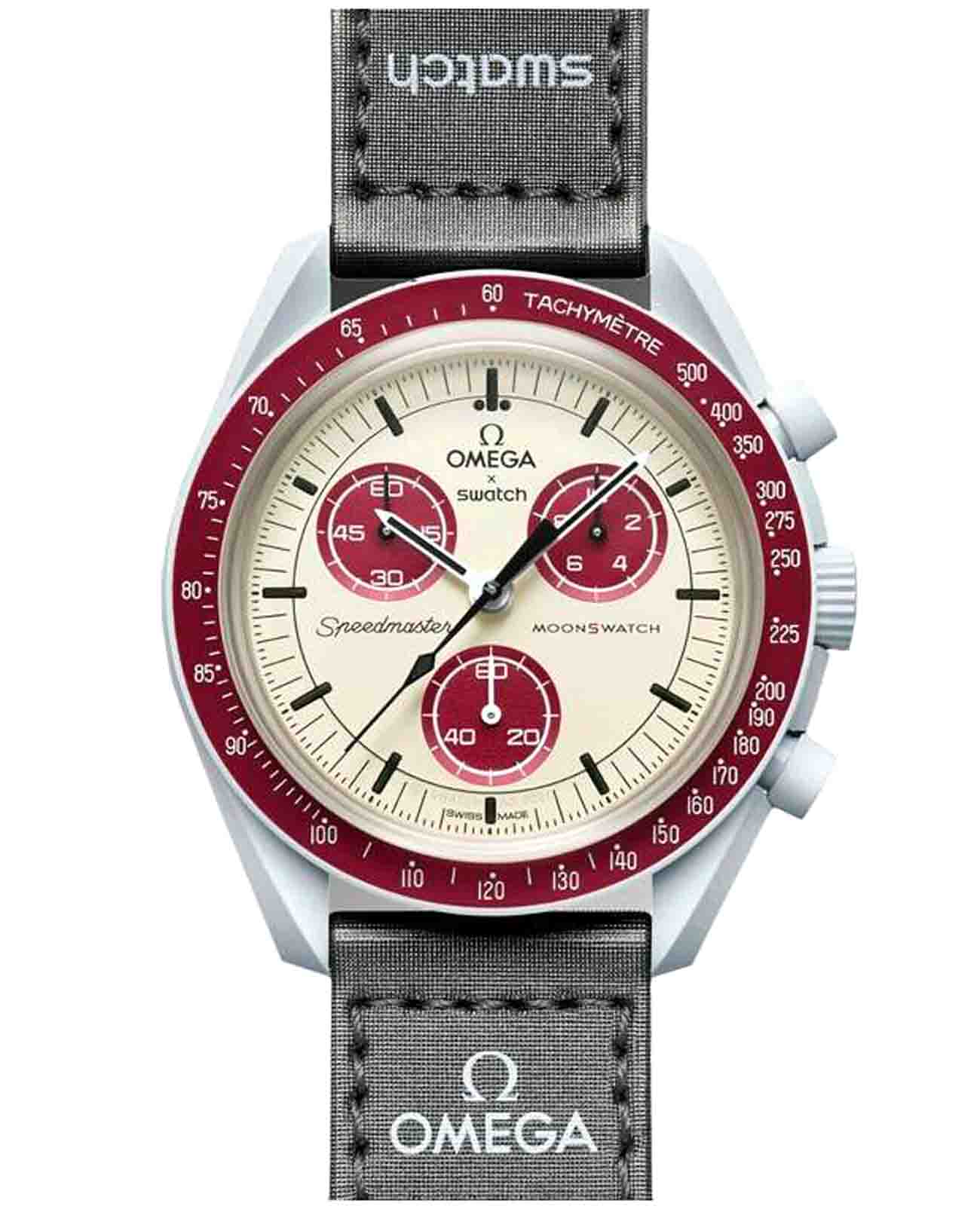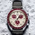 Часы Swatch Bioceramic Moonswatch MISSION TO PLUTO SO33M101 — это стильный и современный аксессуар для тех, кто ценит лёгкость и комфорт. Корпус диаметром 42 мм и пряжка этих уникальных часов изготовлены из биокерамикиБиокерамикаБиокерамика — это материал, который на две трети состоит из керамики, на одну треть — из биопластика. Он сочетает в себе лучшие качества обоих материалов и обладает прочностью и шелковистой на ощупь текстурой., а также ремешок VELCRO®. Модель оснащена циферблатом и бордовым биокерамическим безелемБезельВнешний ободок, закрепляющий стекло. В спортивных часах так называется поворотное кольцо с делениями на циферблате, выполняет роль таймера – замеряет отрезки времени на шкале. Неподвижный безель – элемент декора. Однонаправленно вращающийся безель на дайверских часах позволяет фиксировать моменты погружения и выныривания на поверхность. на который нанесена шкала тахиметраТахиметрРазмеченная шкала, располагается на ободке или безеле часов. Тахиметр позволяет рассчитать скорость на определённом участке пути, расстояние измеряется в километрах или милях.. Общими характеристиками всех часов в данной коллекции являются конструкция стекла из биоматериала, «скрытая» в центре кристалла буква "S", тонкий и изящный круговой узор на внешнем кольце циферблата и заглубленных мини-циферблатах, гладкие ушки с заостренными концами, культовая точка над отметкой 90 на тахиметрической шкале безеля и, конечно же, уникальный материал – биокерамика. Индексы, часовая, минутная и секундная стрелки хронографаХронографФункция позволяет измерять отрезки времени с особой точностью: часы, минуты, секунды. Верным признаком хронографа является наличие на циферблате 3 дополнительных окошек-счётчиков. покрыты люминесцентным покрытиемЛюминесцентное покрытиеПозволяет считывать показания времени в темноте. Производители наносят на стрелки, часовые индексы, безель или поверхность циферблата светонакопительный состав, дающий холодное свечение. Super-LumiNova® класса А, благодаря чему они светятся в темноте. Циферблаты каждых часов в данной коллекции украшены фирменным знаком OMEGA X Swatch, культовым логотипом Speedmaster и логотипом MoonSwatch.