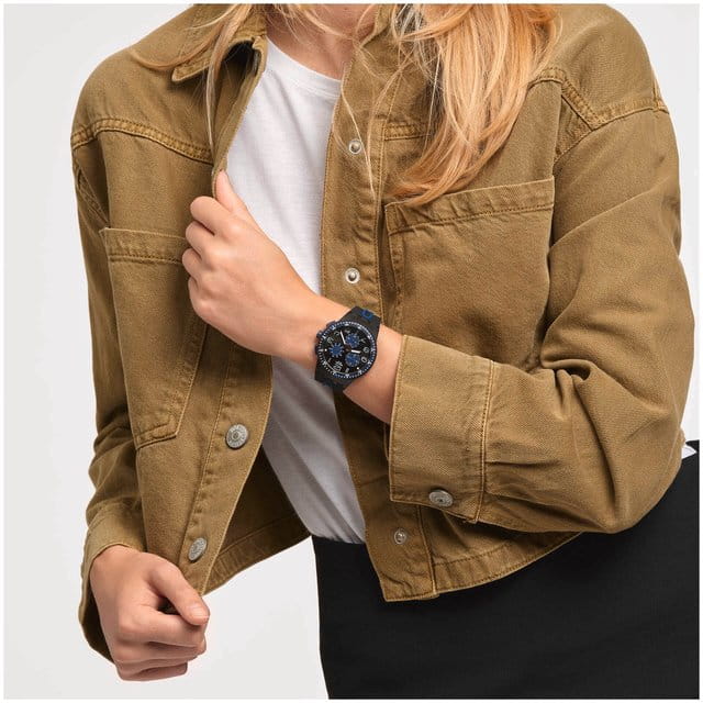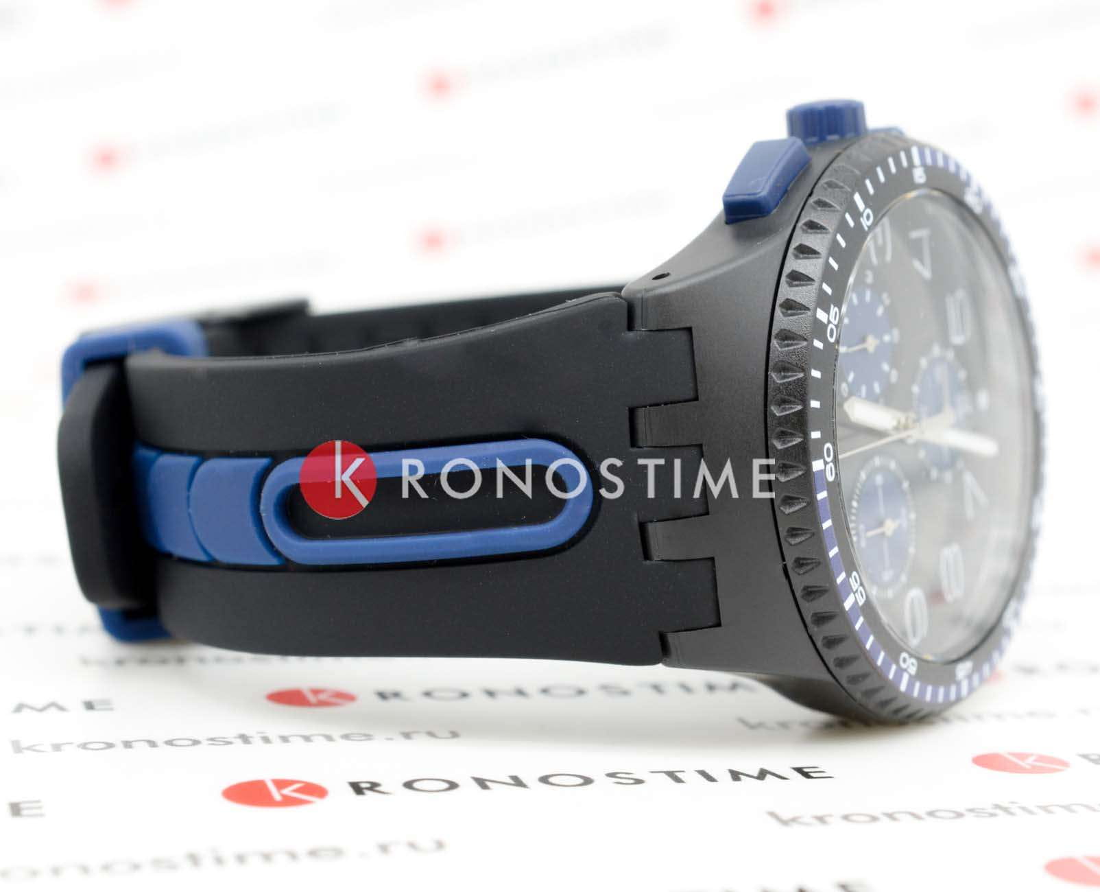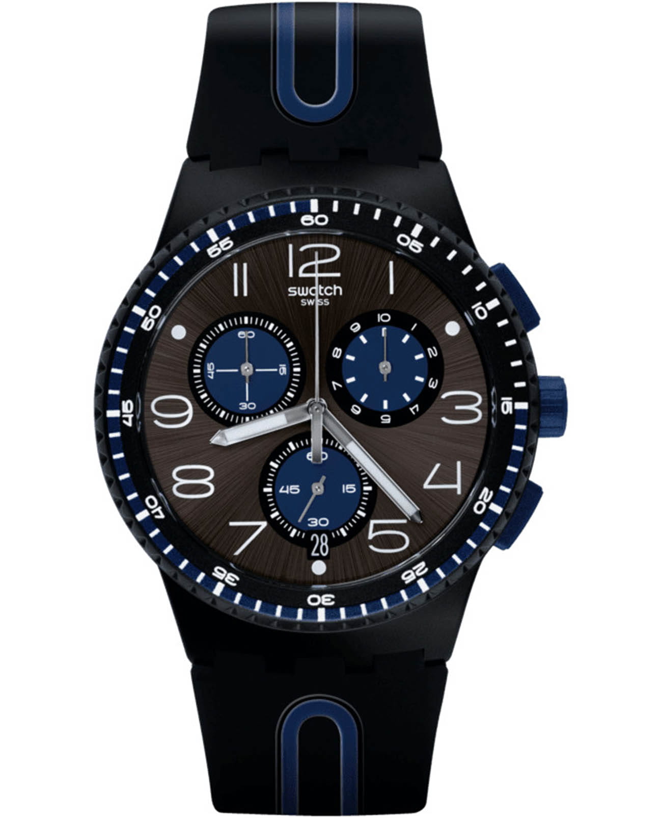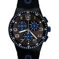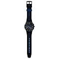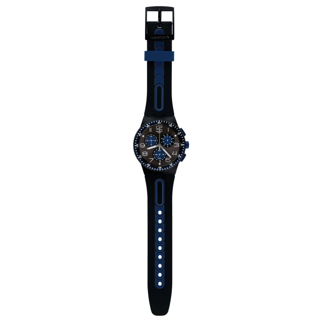 Часы Swatch SUSB406 — это стильный и современный аксессуар для тех, кто ценит лёгкость и комфорт. Часы идеально подойдут как для мужчин, так и для женщин. Первое, на что хочется обратиться внимание у модели этих часов – это их черный циферблат с радиальной полировкой, синими элементами и белыми цифрами. ХронографХронографФункция позволяет измерять отрезки времени с особой точностью: часы, минуты, секунды. Верным признаком хронографа является наличие на циферблате 3 дополнительных окошек-счётчиков. имеет три счетчика и окошко даты у отметки «6 часов» делают эти часы функциональным и современным аксессуаром. На часовую, минутную стрелки нанесено люминесцентное покрытиеЛюминесцентное покрытиеПозволяет считывать показания времени в темноте. Производители наносят на стрелки, часовые индексы, безель или поверхность циферблата светонакопительный состав, дающий холодное свечение., которое светится в темноте, создавая необычное изображение. БезельБезельВнешний ободок, закрепляющий стекло. В спортивных часах так называется поворотное кольцо с делениями на циферблате, выполняет роль таймера – замеряет отрезки времени на шкале. Неподвижный безель – элемент декора. Однонаправленно вращающийся безель на дайверских часах позволяет фиксировать моменты погружения и выныривания на поверхность. и корпус выполнены в матовом черном цвете, а черный ремешок украшен синими акцентами для создания текстурного эффекта. Водозащита 30 метров делает часы практичными для повседневного использования. Эти часы подойдут для повседневного ношения и станут ярким акцентом в вашем наряде.