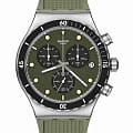 Часы Swatch YVS488 — это стильный и современный аксессуар для тех, кто ценит лёгкость и комфорт. Эта стильная модель часов из нержавеющей стали дополнена зеленым каучуковым ремешком с фактурным верхом и матовой застежкой из нержавеющей стали. Но изюминка этих часов — матовый зеленый циферблат с черными счетчиками хронографаХронографФункция позволяет измерять отрезки времени с особой точностью: часы, минуты, секунды. Верным признаком хронографа является наличие на циферблате 3 дополнительных окошек-счётчиков., индексами и стрелками с люминесцентным покрытиемЛюминесцентное покрытиеПозволяет считывать показания времени в темноте. Производители наносят на стрелки, часовые индексы, безель или поверхность циферблата светонакопительный состав, дающий холодное свечение.. Завершают образ индикатор даты в положении «3 часа» на циферблате, а также серебристые цифры и индексы на безелеБезельВнешний ободок, закрепляющий стекло. В спортивных часах так называется поворотное кольцо с делениями на циферблате, выполняет роль таймера – замеряет отрезки времени на шкале. Неподвижный безель – элемент декора. Однонаправленно вращающийся безель на дайверских часах позволяет фиксировать моменты погружения и выныривания на поверхность. из нержавеющей стали с черным PVDPVDУльтратонкое покрытие наносится в технике вакуумного напыления, сочетает в себе нитрид титана особой прочности со слоем золота или оксида хрома. Несёт в себе декоративную или защитную функцию. покрытием. Водозащита 30 метров делает часы практичными для повседневного использования. Эти часы подойдут для повседневного ношения и станут ярким акцентом в вашем наряде.