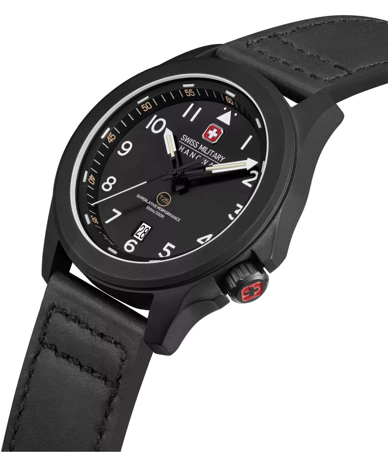 Мужские кварцевые часы Swiss Military Hanowa — это прочный и стильный аксессуар, вдохновлённый классическими полевыми моделями. Корпус диаметром 42 мм выполнен из нержавеющей стали с PVD-покрытиемPVDУльтратонкое покрытие наносится в технике вакуумного напыления, сочетает в себе нитрид титана особой прочности со слоем золота или оксида хрома. Несёт в себе декоративную или защитную функцию.. Циферблат чёрного цвета оформлен индексами и стрелками. Циферблат защищён сапфировым стекломСапфировое стеклоПрочный и надёжный материал из кристалла сапфира синтетического происхождения, характеризующийся особой твёрдостью и устойчивостью к царапинам и повреждениям.. Механизм — швейцарское кварцевое движение Ronda 515 (Swiss Made). Часы оснащены чёрным кожаным ремешком с матовой текстурой на классической пряжке. Водонепроницаемость 100 м позволяет использовать часы для плавания и повседневного ношения. Идеальный выбор для тех, кто ценит швейцарское качество и надёжность.