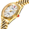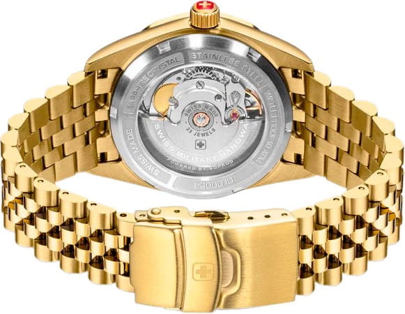 Часы Swiss Military Hanowa Master Diligenter SMWGL0005410 — это образец швейцарской точности и изысканного стиля. Эти механические часы с автоподзаводом оснащены калибром Soprod P024, который обеспечивает надежную работу механизма. Запас хода составляет 38 часов, что гарантирует их бесперебойное функционирование. Элегантный корпус диаметром 41 мм и толщиной 11 мм выполнен из прочной стали с золотистым IP-покрытиемIP-покрытиеМетод ионного напыления. Демонстрирует повышенную устойчивость к истиранию, окислению и химическим веществам. Под воздействием высокого давления и температуры около 1500°C молекулы металла надёжно соединяются с частицами корпуса часов. и украшен рифленым безелемБезельВнешний ободок, закрепляющий стекло. В спортивных часах так называется поворотное кольцо с делениями на циферблате, выполняет роль таймера – замеряет отрезки времени на шкале. Неподвижный безель – элемент декора. Однонаправленно вращающийся безель на дайверских часах позволяет фиксировать моменты погружения и выныривания на поверхность.. Серебристый текстурированный циферблат защищен сапфировым стекломСапфировое стеклоПрочный и надёжный материал из кристалла сапфира синтетического происхождения, характеризующийся особой твёрдостью и устойчивостью к царапинам и повреждениям., которое устойчиво к царапинам и сохраняет безупречный вид. Метки в виде штрихов и стрелки имеют люминесцентное покрытиеЛюминесцентное покрытиеПозволяет считывать показания времени в темноте. Производители наносят на стрелки, часовые индексы, безель или поверхность циферблата светонакопительный состав, дающий холодное свечение., которое обеспечивает видимость в темноте после кратковременной зарядки на свету. Окошко даты с увеличительным стеклом расположено в положении 3 часа, а фирменный логотип Swiss Military Hanowa находится в позиции 12 часов. Заводная головка с рифлением украшена фирменным логотипом, добавляя часам изысканный акцент. Прозрачная задняя крышка позволяет наблюдать за работой механизма, подчеркивая внимание к деталям. Завершает образ стальной браслет с золотистым IP-покрытиемIP-покрытиеМетод ионного напыления. Демонстрирует повышенную устойчивость к истиранию, окислению и химическим веществам. Под воздействием высокого давления и температуры около 1500°C молекулы металла надёжно соединяются с частицами корпуса часов. и раскладной застёжкойРаскладная застёжкаТакой тип застёжки используется только на браслетах из металла. Она никогда не раскрывается полностью, происходит разделение на 2 и более частей. Раскладывающая застёжка снизит вероятность потери часов к минимуму., который удобно сидит на запястье и обеспечивает надежную фиксацию. Часы обладают водозащитой уровня 100WR, что делает их подходящими для повседневного использования и активного образа жизни.