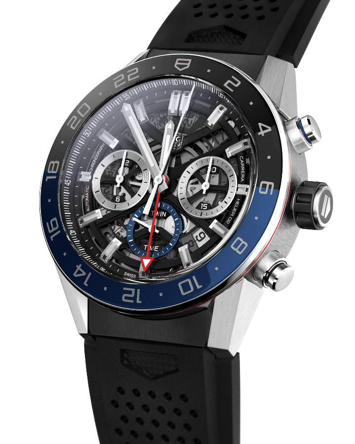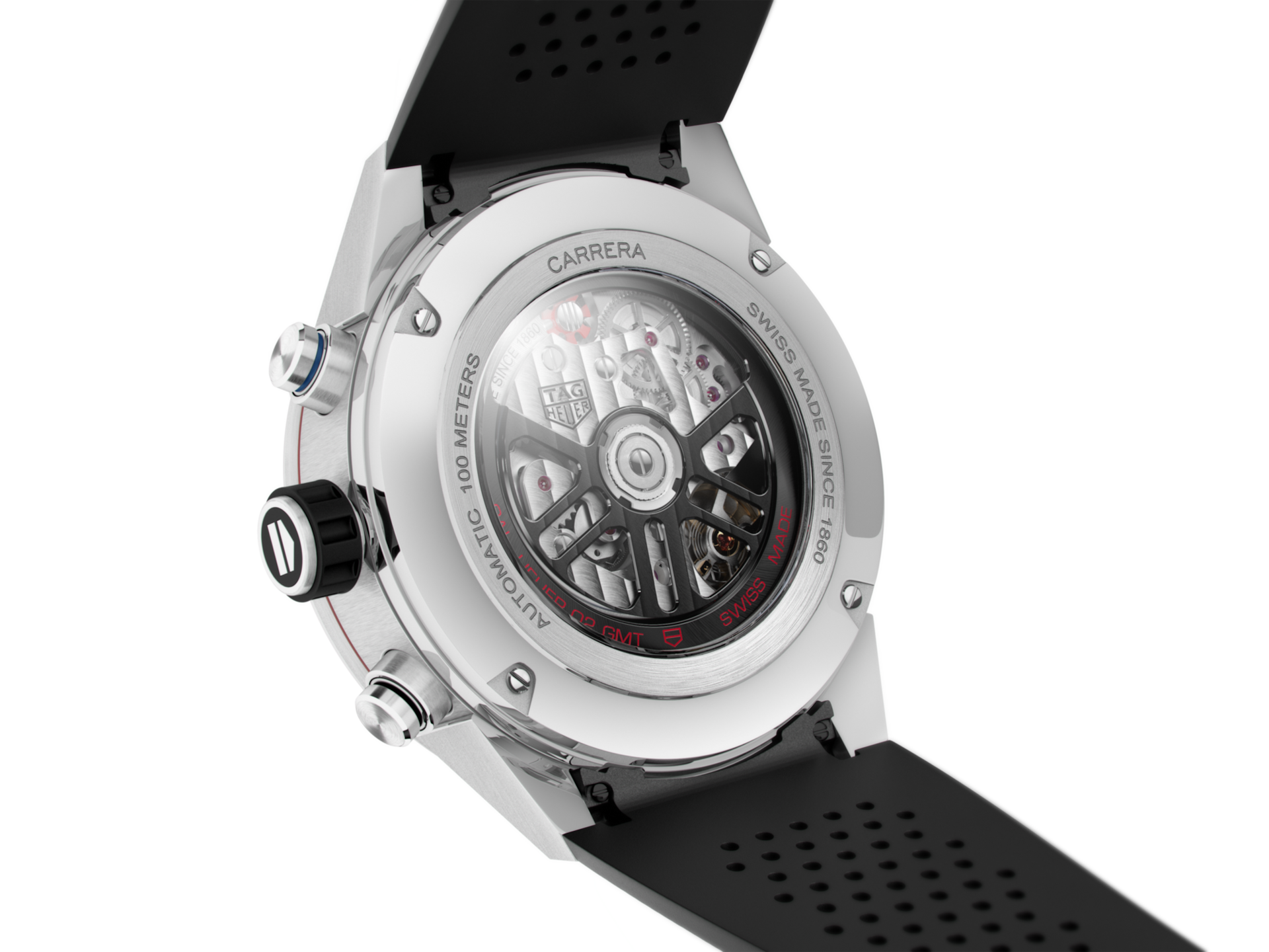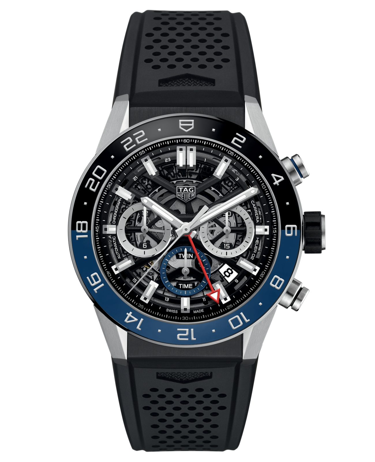 Часы TAG Heuer Carrera Chronograph GMT оснащены мануфактурным механизмом Calibre HEUER 02. Модель имеет черный циферблат, стальной корпус диаметром 45 мм и неподвижный безель из керамики синего и черного цветов. Ремешок из каучука с перфорацией воздает дань уважения наследию Carrera в мире автоспорта. Часовой механизм обладает впечатляющим 80-часовым запасом хода. TAG Heuer Carrera CBG2A1Z.FT6157, механический механизм (автоматический калибр) с высокой точностью. Сапфировое стекло устойчивое к появлению царапин, обладающее высокой прозрачностью. Класс водозащиты: 100 метров, позволит плавать, нырять и заниматься другими водными видами спорта. Корпус часов изготовлен из стали, серебристого цвета.