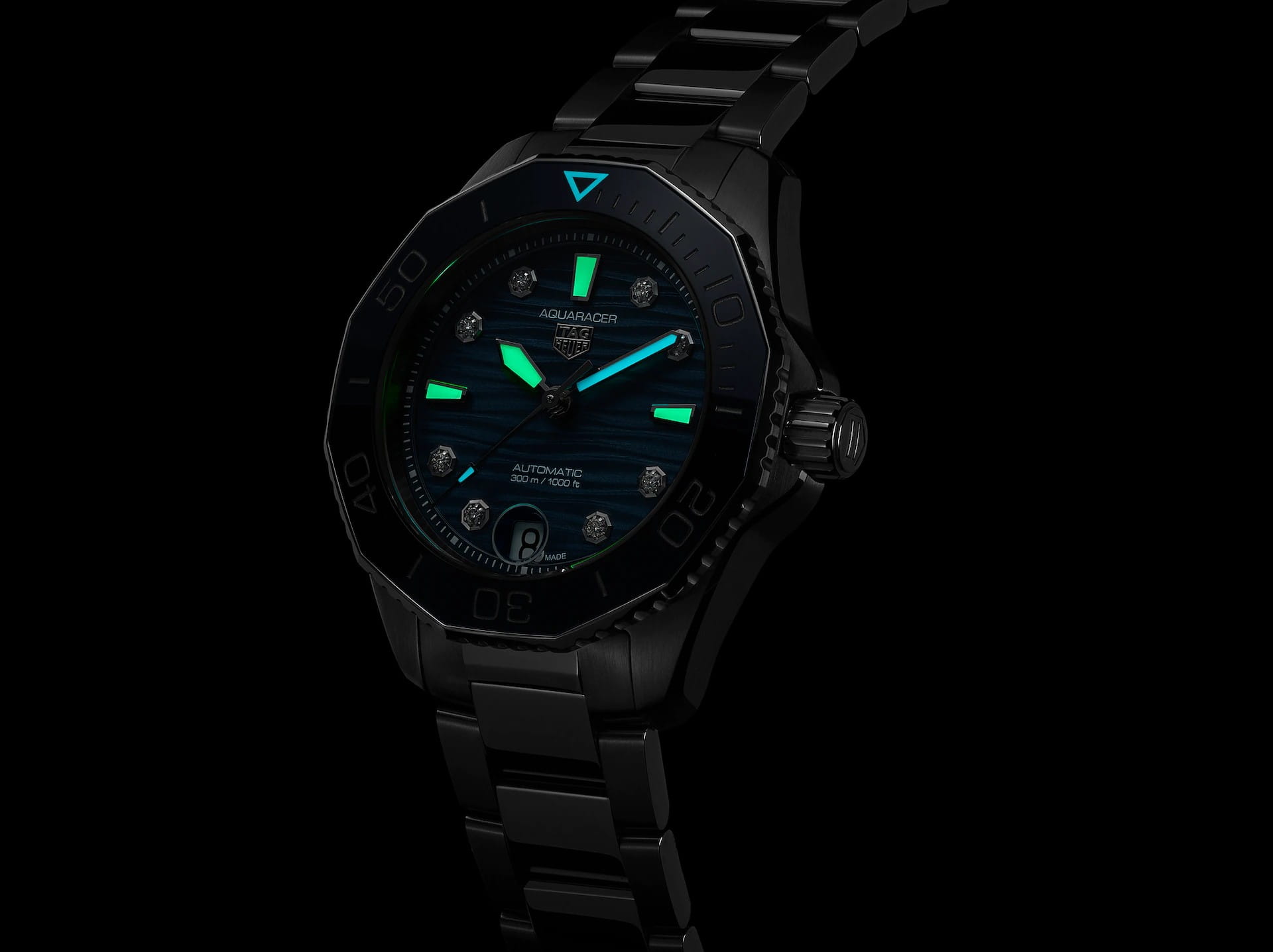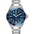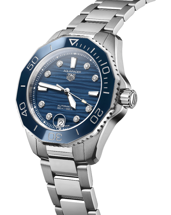 Часы TAG Heuer Aquaracer, оснащенные механизмом с автоподзаводом Calibre 5. Циферблат, покрытый синим лаком с волнистой отделкой - это вызов превзойти самого себя. Приспособлен для самых глубоких морей, одновременно повышая планку универсальности.