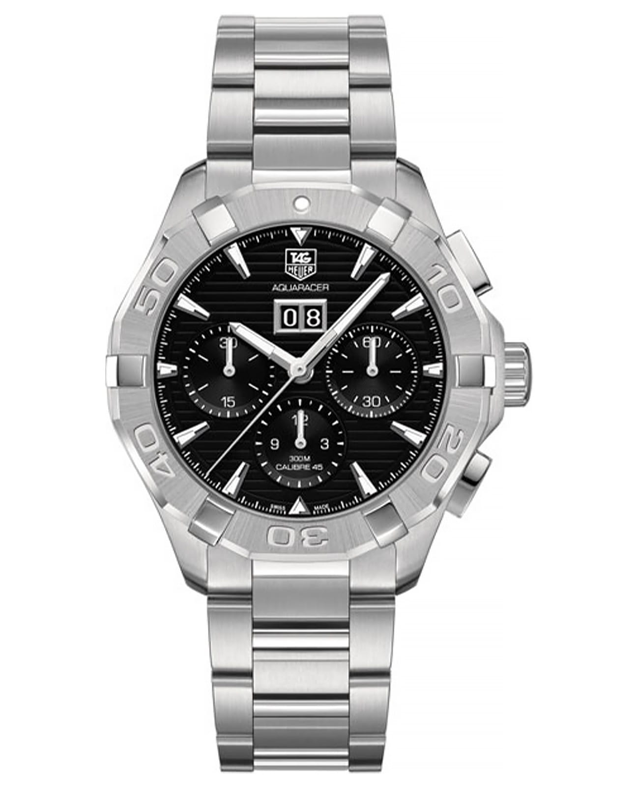 Наручные часы-хронографХронографФункция позволяет измерять отрезки времени с особой точностью: часы, минуты, секунды. Верным признаком хронографа является наличие на циферблате 3 дополнительных окошек-счётчиков. TAG Heuer Carrera CAY211Z.BA0926 олицетворяют собой спортивный стиль и высокие технологии. Механический механизм (автоматический калибр) CALIBRE 45 с высокой точностью производится целиком в стенах компании. Стальной корпус с фиксированным безелемБезельВнешний ободок, закрепляющий стекло. В спортивных часах так называется поворотное кольцо с делениями на циферблате, выполняет роль таймера – замеряет отрезки времени на шкале. Неподвижный безель – элемент декора. Однонаправленно вращающийся безель на дайверских часах позволяет фиксировать моменты погружения и выныривания на поверхность.. Диаметр часов 43 мм.Сапфировое стеклоСапфировое стеклоПрочный и надёжный материал из кристалла сапфира синтетического происхождения, характеризующийся особой твёрдостью и устойчивостью к царапинам и повреждениям. устойчивое к появлению царапин, обладающее высокой прозрачностью.Люминесцентная подсветкаЛюминесцентное покрытиеПозволяет считывать показания времени в темноте. Производители наносят на стрелки, часовые индексы, безель или поверхность циферблата светонакопительный состав, дающий холодное свечение. стрелок и меток на циферблате. Класс водозащиты: 300 метров. Раскладная застёжкаРаскладная застёжкаТакой тип застёжки используется только на браслетах из металла. Она никогда не раскрывается полностью, происходит разделение на 2 и более частей. Раскладывающая застёжка снизит вероятность потери часов к минимуму.. Запас хода составляет 40 часов.