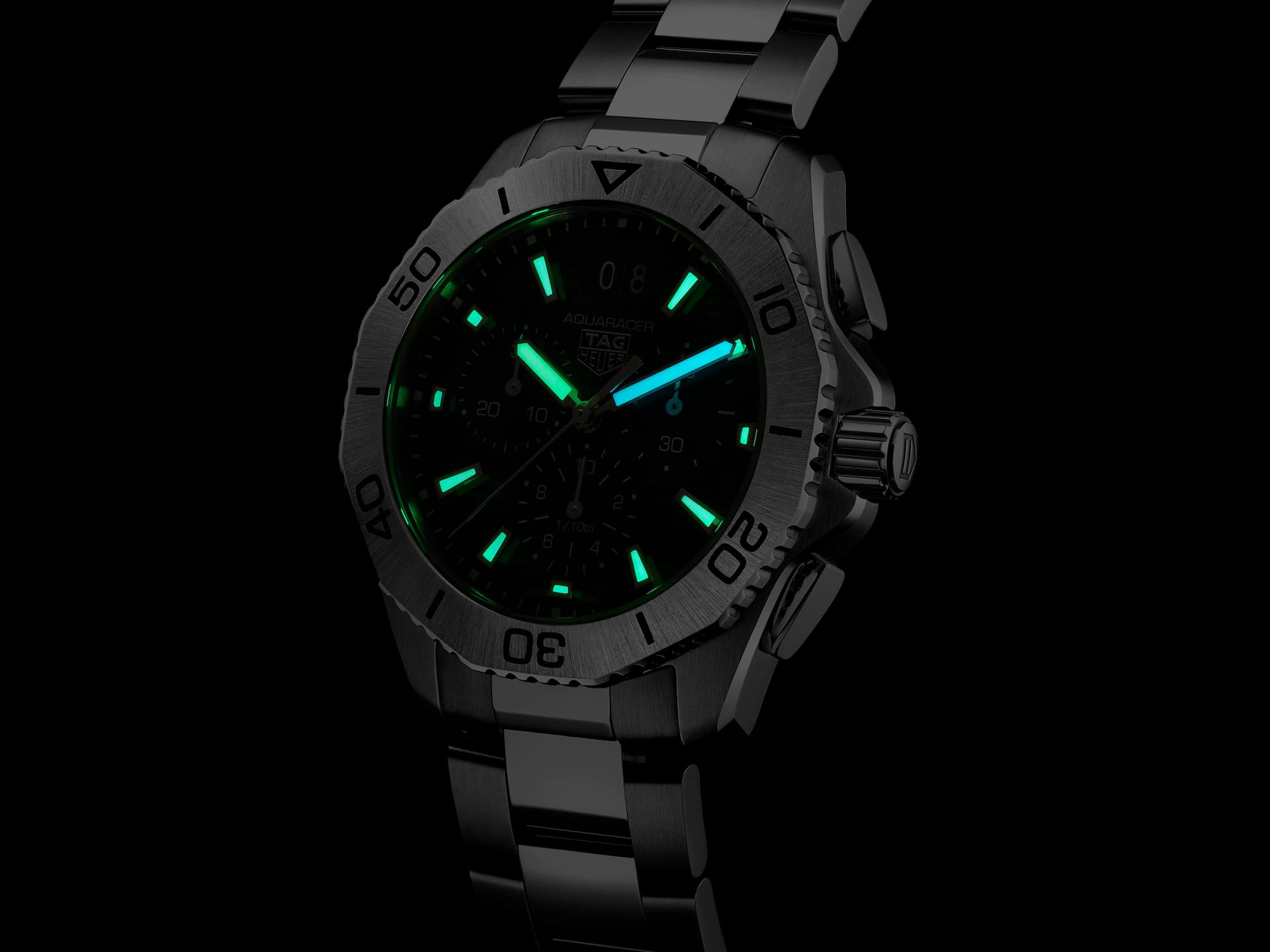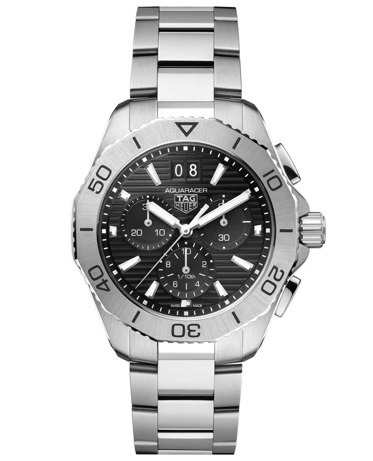 Новые мужские часы-хронографХронографФункция позволяет измерять отрезки времени с особой точностью: часы, минуты, секунды. Верным признаком хронографа является наличие на циферблате 3 дополнительных окошек-счётчиков. TAG Heuer Aquaracer Professional 200 Date CBP1110.BA0627 диаметром 40 мм отличаются непринужденным и эффектным дизайном и отлично подходят для повседневного использования. Циферблат с люминесцентным покрытиемЛюминесцентное покрытиеПозволяет считывать показания времени в темноте. Производители наносят на стрелки, часовые индексы, безель или поверхность циферблата светонакопительный состав, дающий холодное свечение. стрелок и меток, дополнен сапфировым стекломСапфировое стеклоПрочный и надёжный материал из кристалла сапфира синтетического происхождения, характеризующийся особой твёрдостью и устойчивостью к царапинам и повреждениям., устойчивым к появлению царапин и обладающее высокой прозрачностью. Корпус часов изготовлен из стали, серебристого цвета. Заключенный в прочный стальной корпус с соответствующим однонаправленным безелемБезельВнешний ободок, закрепляющий стекло. В спортивных часах так называется поворотное кольцо с делениями на циферблате, выполняет роль таймера – замеряет отрезки времени на шкале. Неподвижный безель – элемент декора. Однонаправленно вращающийся безель на дайверских часах позволяет фиксировать моменты погружения и выныривания на поверхность., стильный серебристый циферблат с матовым эффектом «солнечные лучи» воплощает в себе неподвластную времени элегантность. Водонепроницаемость до 200 метров, эти невероятно прочные часы идеально сядут на ваше запястье благодаря удобному удлиняющему звену стального браслета.