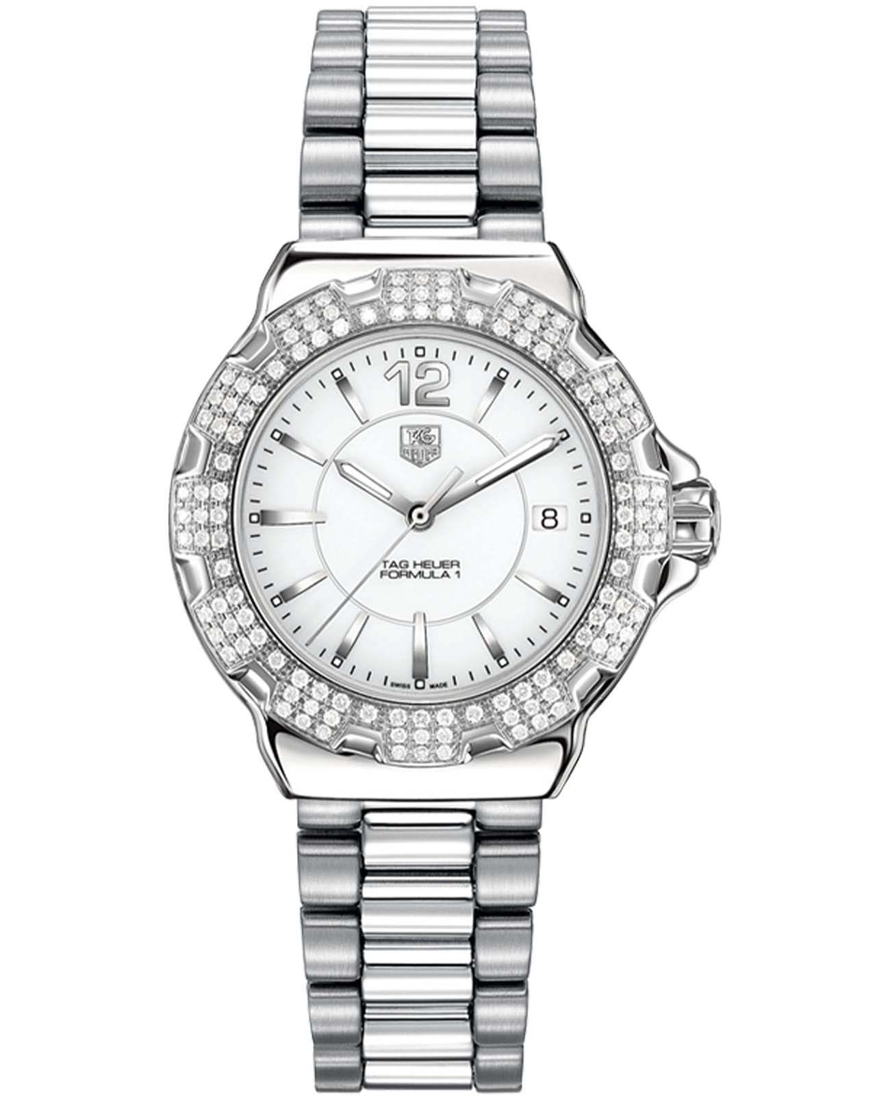 Швейцарские женские часы TAG Heuer Formula 1 — это воплощение элегантности, роскоши и точности. Модель WAH1218.BA0852 из коллекции Formula 1 вдохновлена миром автоспорта, сочетая в себе динамику, выносливость и безупречный стиль. Корпус выполнен из высококачественной нержавеющей стали 316L, что обеспечивает долговечность и устойчивость к внешним воздействиям. Циферблат с эффектом sunray добавляет модели особую привлекательность и элегантность. Циферблат защищен прочным сапфировым стекломСапфировое стеклоПрочный и надёжный материал из кристалла сапфира синтетического происхождения, характеризующийся особой твёрдостью и устойчивостью к царапинам и повреждениям., которое не царапается при механическом воздействии и гарантирует четкую видимость показаний в любых условиях. Безель декорирован бриллиантами, что делает модель особенно роскошной и премиальной. Окошко даты расположено в удобном месте на циферблате, добавляя функциональности. Механизм часов кварцевый, что гарантирует исключительную точность хода. Водозащита до 20 атм (WR200) делает эти часы подходящими для плавания и других водных видов спорта. Браслет из нержавеющей стали оснащен надежной раскладывающейся застежкой с кнопками Раскладная застёжкаТакой тип застёжки используется только на браслетах из металла. Она никогда не раскрывается полностью, происходит разделение на 2 и более частей. Раскладывающая застёжка снизит вероятность потери часов к минимуму., обеспечивающей комфортную фиксацию на запястье.