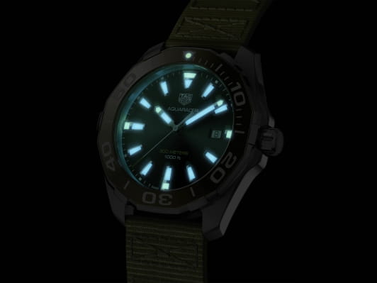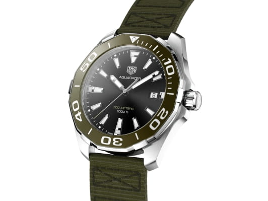 TAG Heuer Aquaracer WAY101L.FC8222 – элегантные мужские часы, сочетающие стиль и функциональность. Корпус диаметром 43 мм выполнен из нержавеющей стали с безелемБезельВнешний ободок, закрепляющий стекло. В спортивных часах так называется поворотное кольцо с делениями на циферблате, выполняет роль таймера – замеряет отрезки времени на шкале. Неподвижный безель – элемент декора. Однонаправленно вращающийся безель на дайверских часах позволяет фиксировать моменты погружения и выныривания на поверхность. из алюминия и стали с PVD-покрытиемPVDУльтратонкое покрытие наносится в технике вакуумного напыления, сочетает в себе нитрид титана особой прочности со слоем золота или оксида хрома. Несёт в себе декоративную или защитную функцию., устойчивым к царапинам. Тёмно-зелёный циферблат с солнечным узором оснащён накладными часовыми метками и стрелками с люминесцентным покрытиемЛюминесцентное покрытиеПозволяет считывать показания времени в темноте. Производители наносят на стрелки, часовые индексы, безель или поверхность циферблата светонакопительный состав, дающий холодное свечение., обеспечивающим отличную читаемость в любых условиях освещения. Часы оснащены точным кварцевым механизмом, гарантирующим надёжное отображение времени. Функциональность включает индикацию часов, минут, секунд и даты, расположенной на отметке «3 часа». Сапфировое стеклоСапфировое стеклоПрочный и надёжный материал из кристалла сапфира синтетического происхождения, характеризующийся особой твёрдостью и устойчивостью к царапинам и повреждениям. с антибликовым покрытиемАнтибликовое покрытиеСлой оксида металла в 0,13-0,3 микрон, благодаря которому стекло часов не бликует и не отражает свет. Антибликовое покрытие уменьшает отражение света в 10 раз, обеспечивая отличную читаемость показателей циферблата. обеспечивает защиту от царапин и превосходную читаемость. Тёмно-зелёный нейлоновый ремешок оснащён классической застёжкой-пряжкой из нержавеющей стали. Водозащита до 300 метров (30 бар) делает модель подходящей для дайвинга и других водных видов спорта.