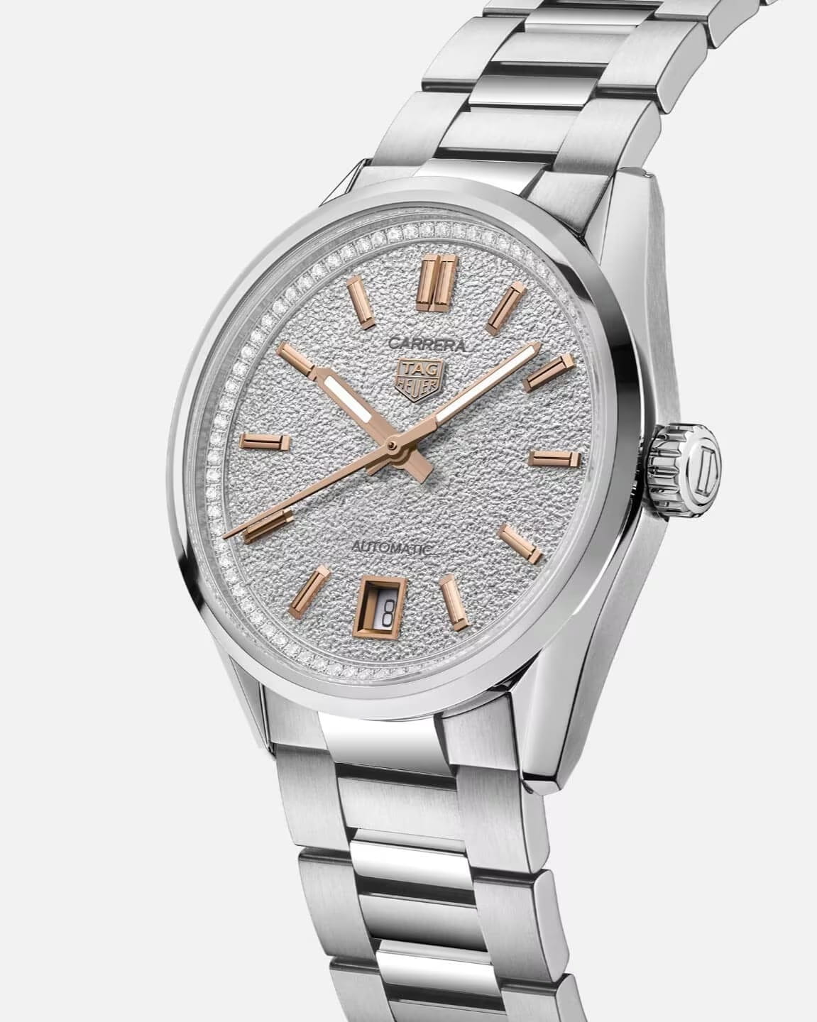Утончённые часы TAG Heuer Carrera Date WBN231B.BA0001 созданы для стильных и смелых женщин. Механический механизм (автоматический калибр) с высокой точностью производится целиком в стенах компании. Сапфировое стеклоСапфировое стеклоПрочный и надёжный материал из кристалла сапфира синтетического происхождения, характеризующийся особой твёрдостью и устойчивостью к царапинам и повреждениям. устойчивое к появлению царапин, обладающее высокой прозрачностью. На стрелки нанесено люминесцентное покрытиеЛюминесцентное покрытиеПозволяет считывать показания времени в темноте. Производители наносят на стрелки, часовые индексы, безель или поверхность циферблата светонакопительный состав, дающий холодное свечение.. Класс водозащиты: 50 метров, позволит защитить корпус от случайных брызг или капель дождя. Браслет с раскладной застёжкойРаскладная застёжкаТакой тип застёжки используется только на браслетах из металла. Она никогда не раскрывается полностью, происходит разделение на 2 и более частей. Раскладывающая застёжка снизит вероятность потери часов к минимуму.. Апертура даты находится на отметке 6 часов. БезельБезельВнешний ободок, закрепляющий стекло. В спортивных часах так называется поворотное кольцо с делениями на циферблате, выполняет роль таймера – замеряет отрезки времени на шкале. Неподвижный безель – элемент декора. Однонаправленно вращающийся безель на дайверских часах позволяет фиксировать моменты погружения и выныривания на поверхность. инкрустирован 76 бриллиантами.
