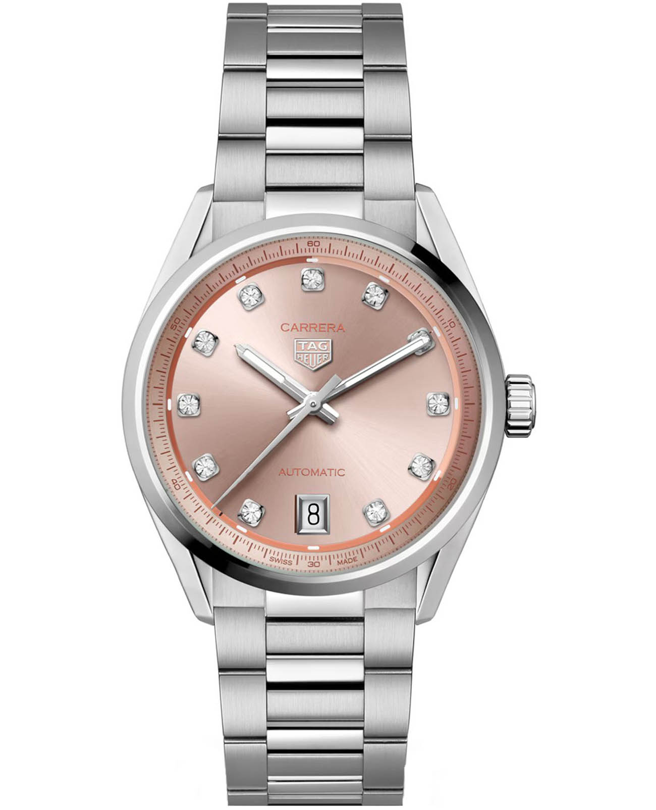 TAG Heuer Carrera Date WBN231D.BA0001 — эта знаковая и стильная версия культовых часов выполнена из стали с 11 бриллиантами. На изысканном розовом циферблате: указатель даты в положении «6 часов». Часы с люминесцентным покрытиемЛюминесцентное покрытиеПозволяет считывать показания времени в темноте. Производители наносят на стрелки, часовые индексы, безель или поверхность циферблата светонакопительный состав, дающий холодное свечение. Superluminova. Изысканный полированный стальной корпус диаметром 36 мм защищают автоматический механизм Calibre 7, демонстрируемый через прозрачную заднюю крышку. Предлагая гарантированную водонепроницаемость до 50 метров, это изделие демонстрирует великолепный браслет из стали и застегивается с раскладной застёжкойРаскладная застёжкаТакой тип застёжки используется только на браслетах из металла. Она никогда не раскрывается полностью, происходит разделение на 2 и более частей. Раскладывающая застёжка снизит вероятность потери часов к минимуму.. Циферблат защищен сапфировым стекломСапфировое стеклоПрочный и надёжный материал из кристалла сапфира синтетического происхождения, характеризующийся особой твёрдостью и устойчивостью к царапинам и повреждениям.. Эта модель – отличный выбор для тех, кто ищет сочетание стиля, качества и функциональности. Часы станут не только полезным аксессуаром, но и выразительным элементом вашего имиджа.