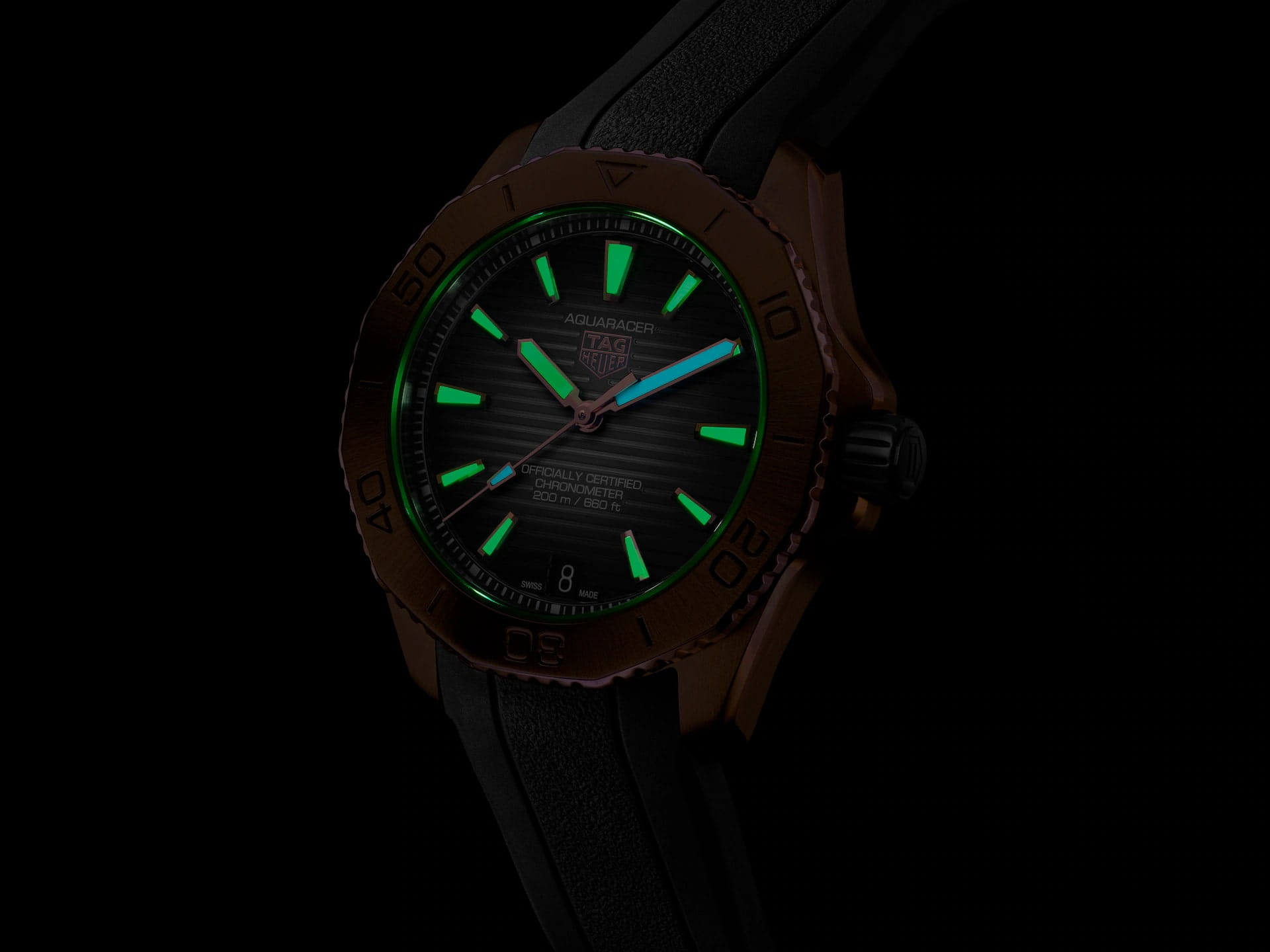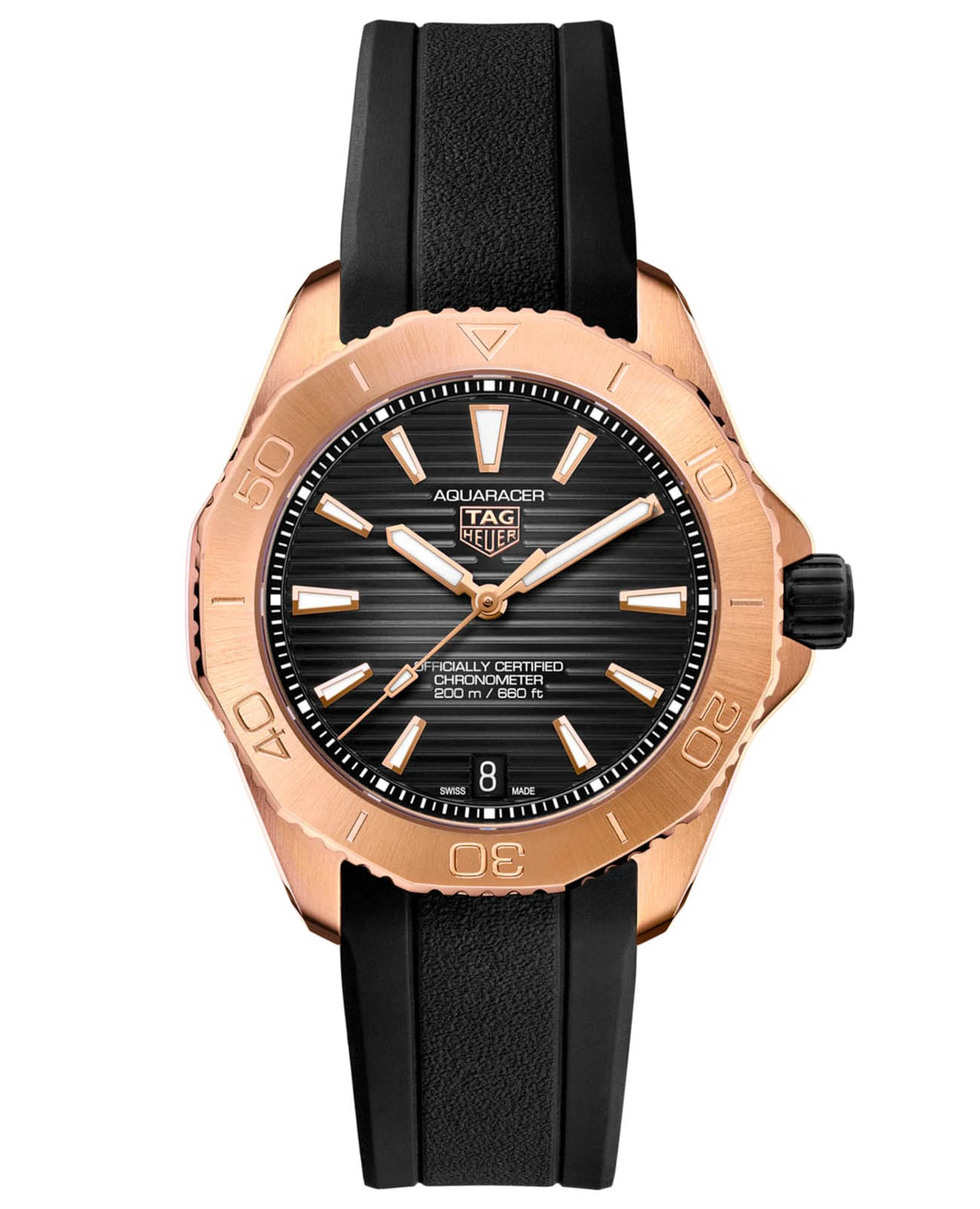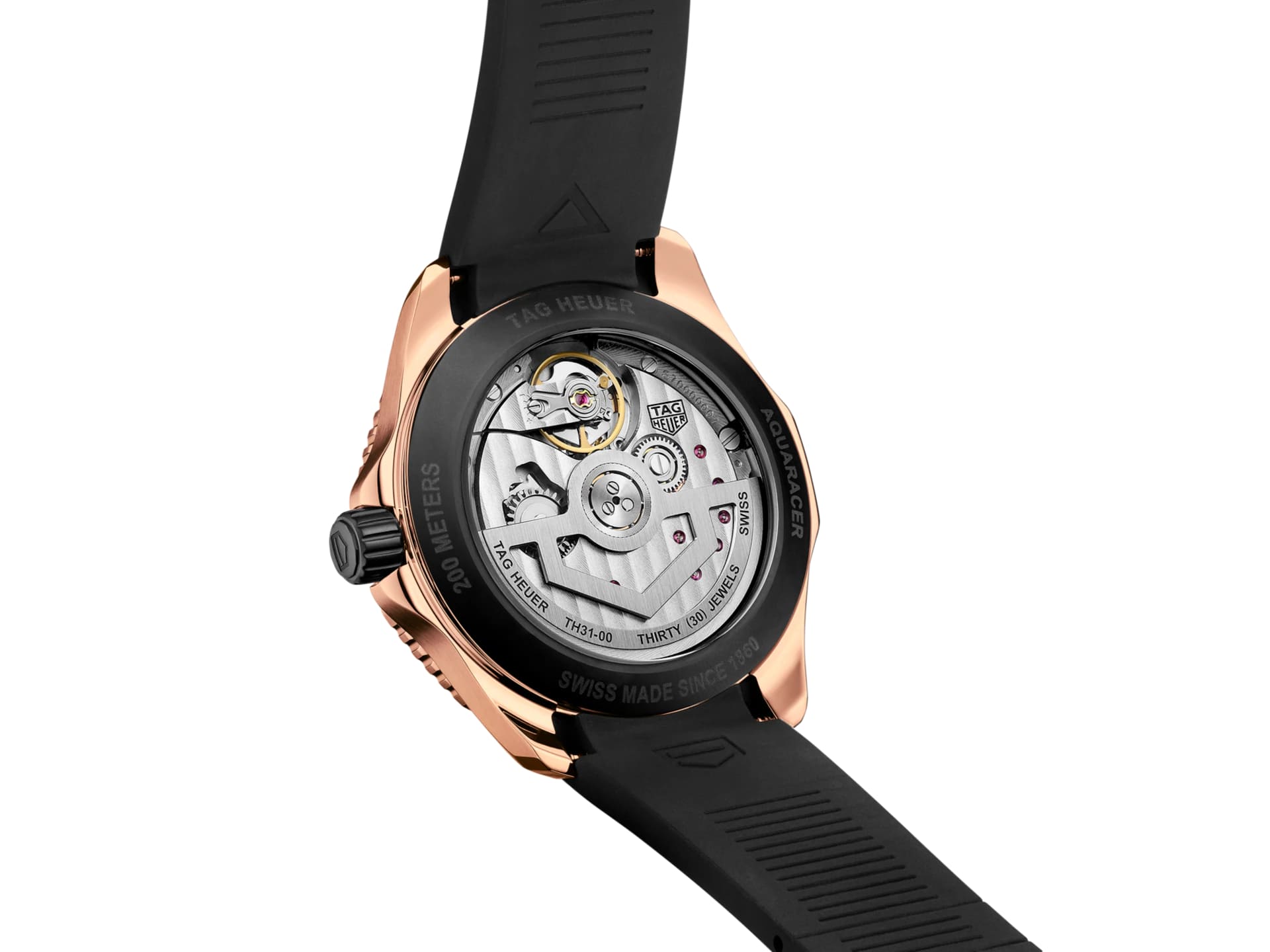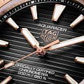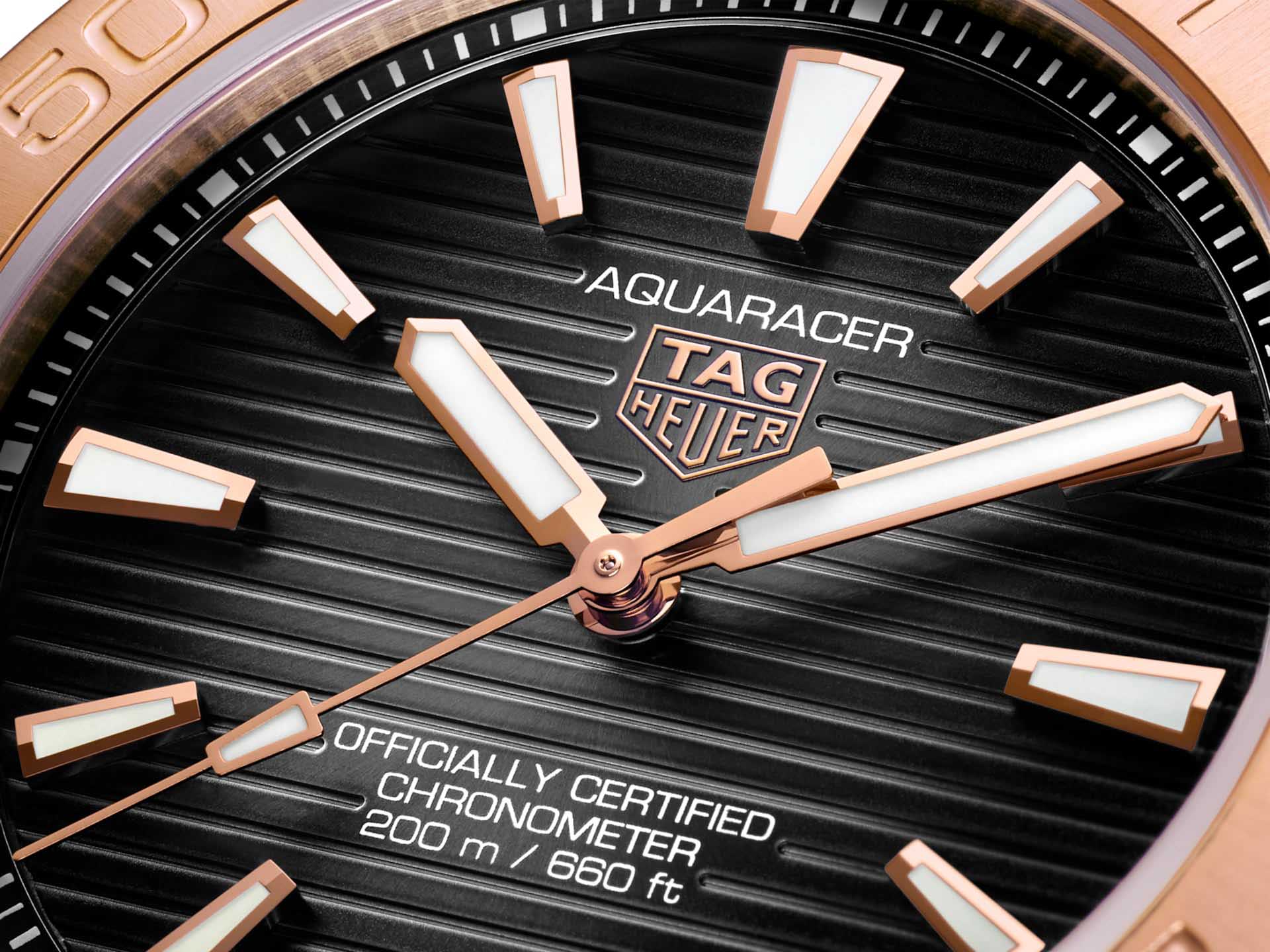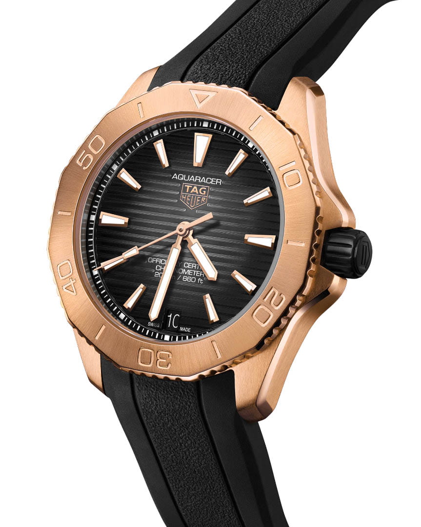 Изящный корпус этой модели TAG Heuer Aquaracer, выполненный из цельного розового 18-каратного золото18-каратное золотоОбозначение по каратной системе пробирования, оно показывает, сколько драгоценного металла содержится в изделии. 18 карат - в составе 75% чистого золота, соответствует 750 пробе.