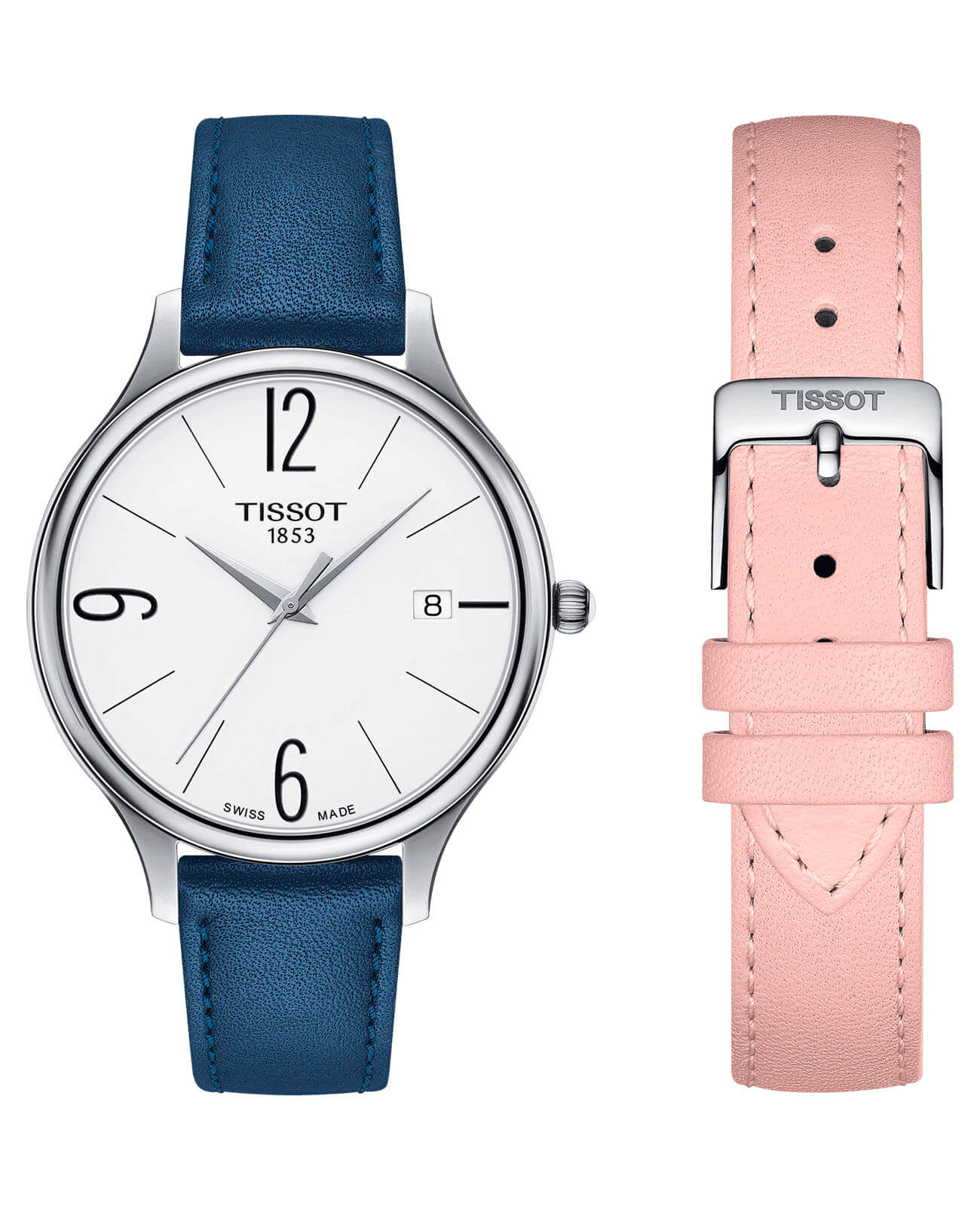 Оригинальная модель с синим кожаным ремешком имеет в комплекте дополнительный сменный вариант в нежно-розовом цвете. Вы сможете выбирать оттенок в зависимости от стиля и настроения, создаётся впечатление, будто вы обладаете двумя разными аксессуарами. Часы работают за счёт кварцевого калибра ETA F06.111. Сапфировое стекло противостоит появлению царапин и отметин. Окошко даты на позиции 3 часов. Функция EOLEOLПредставляет собой систему, уведомляющую владельца часов о необходимости замены элемента питания. За 2 недели до полного разряда батарейки секундная стрелка перестаёт ходить чётко и начинает перепрыгивать на 3-4 деления.. Габариты: 38 x 38 x 7,1 мм.