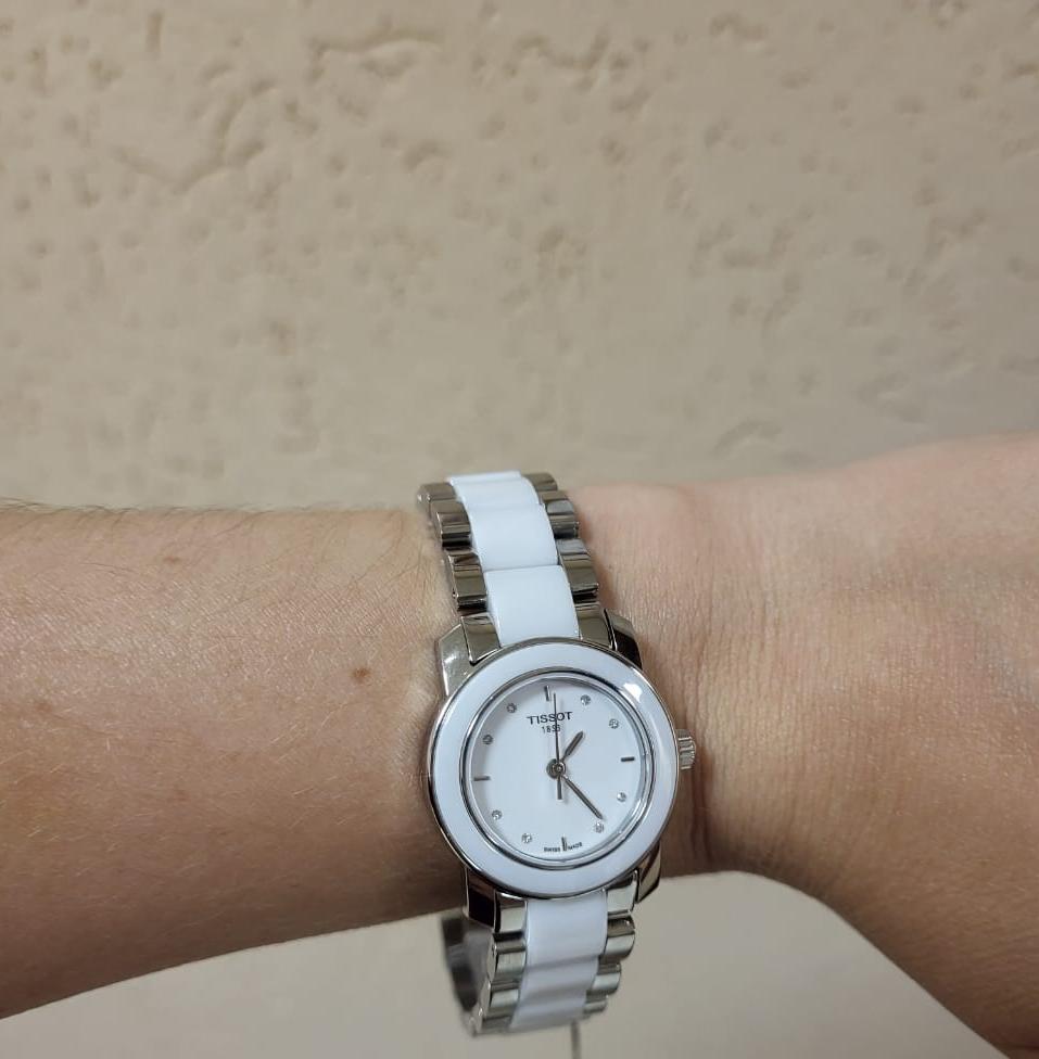 Модель в серебристо-белом оформлении станет изящным украшением к вечернему платью или классическому костюму. Для изготовления часов использовались современные материалы: хирургическая сталь и керамика, отличающаяся гипоаллергенными свойствами. Керамика принимает температурный режим тела человека и обеспечивает комфорт при ношении. Циферблат инкрустирован бриллиантами, имеющими законное происхождение. Кварцевый механизм ETA F03.111. Функция EOLEOLПредставляет собой систему, уведомляющую владельца часов о необходимости замены элемента питания. За 2 недели до полного разряда батарейки секундная стрелка перестаёт ходить чётко и начинает перепрыгивать на 3-4 деления.. Габариты: 28 x 28 x 6,4 мм.