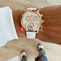 TISSOT Dressport Quartz Chronograph - женские кварцевые наручные часы. Корпус этих часов среднего размера (35 мм) и выполнен из нержавеющей стали L316 с PVD-покрытием цвета розового золота. Модель имеет устойчивое к царапинам сапфировое стекло, ремешок из натуральной кожи белого цвета, перламутровый циферблат. Калибр механизма: ETA G15.211. Класс водозащиты: 30 м / 3 АТМ (защита от брызг и случайных капель). Дополнительные функции и особенности: отображение числа, хронограф (секундомер).