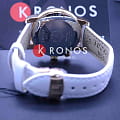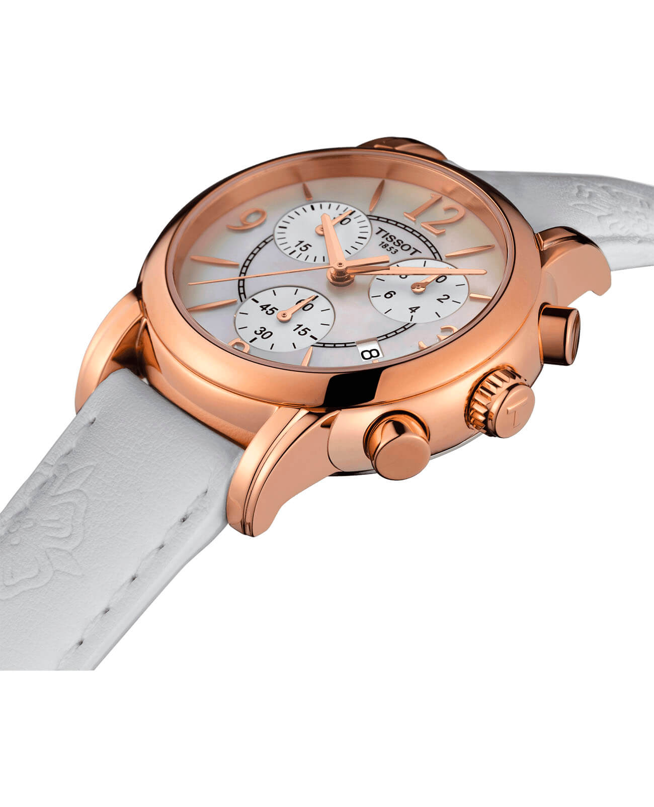 Светлый перламутровый циферблат имеет три миниатюрных счётчика хронографаХронографФункция позволяет измерять отрезки времени с особой точностью: часы, минуты, секунды. Верным признаком хронографа является наличие на циферблате 3 дополнительных окошек-счётчиков., которые придают аксессуару особый стиль. Цветные стрелки и часовые индексы сделаны в тон PVD-покрытиюPVDУльтратонкое покрытие наносится в технике вакуумного напыления, сочетает в себе нитрид титана особой прочности со слоем золота или оксида хрома. Несёт в себе декоративную или защитную функцию. корпуса оттенка розового золота. Женственный белый ремешок из натуральной кожи украшен тиснением в виде цветка. Швейцарский кварцевый калибр ETA G15.211. Сапфировое стекло. Секундомер, апертура даты. . Габариты: 35 x 35 x 10 мм.