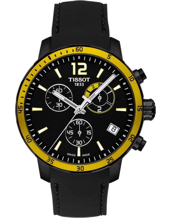 TISSOT T0954493705700 T-Sport Quickster Quartz Chronograph - мужские кварцевые наручные часы Корпус этих часов среднего размера (42 мм) и выполнен из нержавеющей стали L316с PVD-покрытием черного цвета Модель TISSOT T0954493705700 T-Sport Quickster Quartz Chronograph имеет устойчивое к царапинам сапфировое стекло, ремешок из натурального каучука черного цвета, черный циферблат Калибр механизма: ETA G10212 Класс водозащиты: 100 м / 10 АТМ (разрешается плавание и ныряние без акваланга) Дополнительные функции и особенности: отображение числа, хронограф (секундомер) Полная заводская комплектация TISSOT: оригинальные часы, фирменная коробка, инструкция, сервисная книжка, роман о часовой фабрике, миникаталог, замшевый фирменный чехол черного цвета для хранения и/или переноски часов, кассовый и товарный чеки Международная гарантия 2 года Производство и сборка: Швейцария