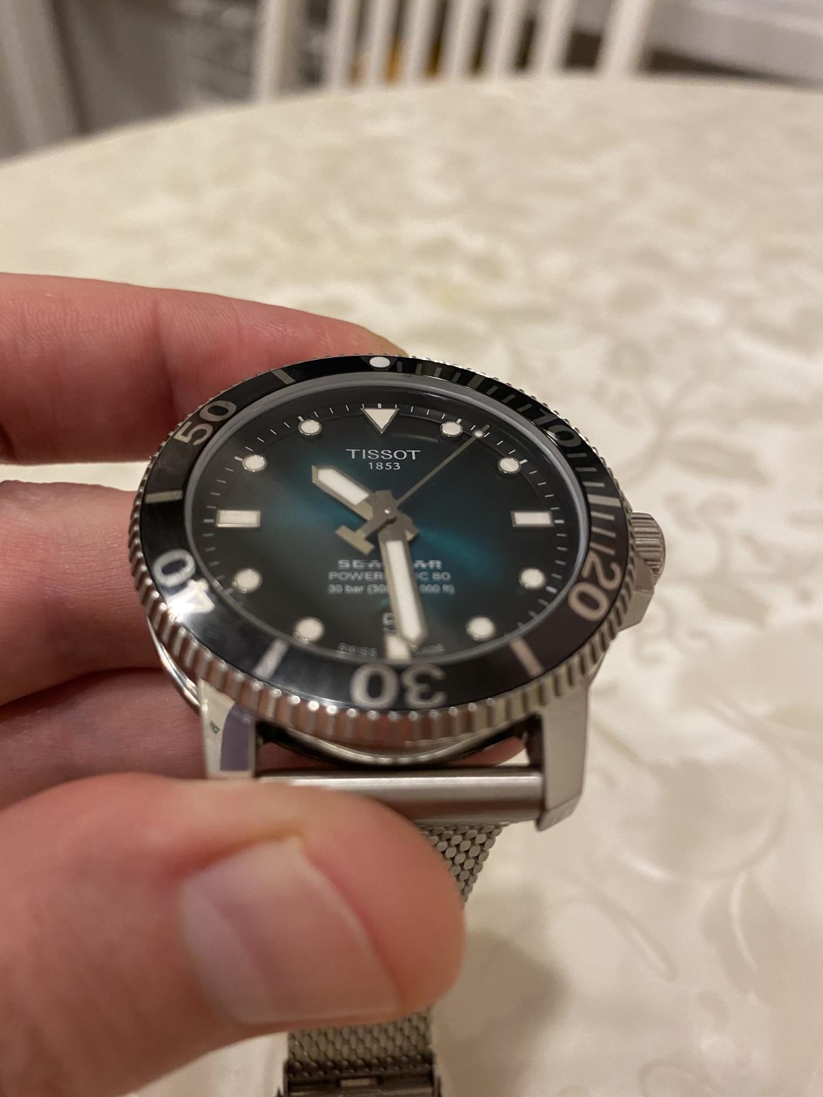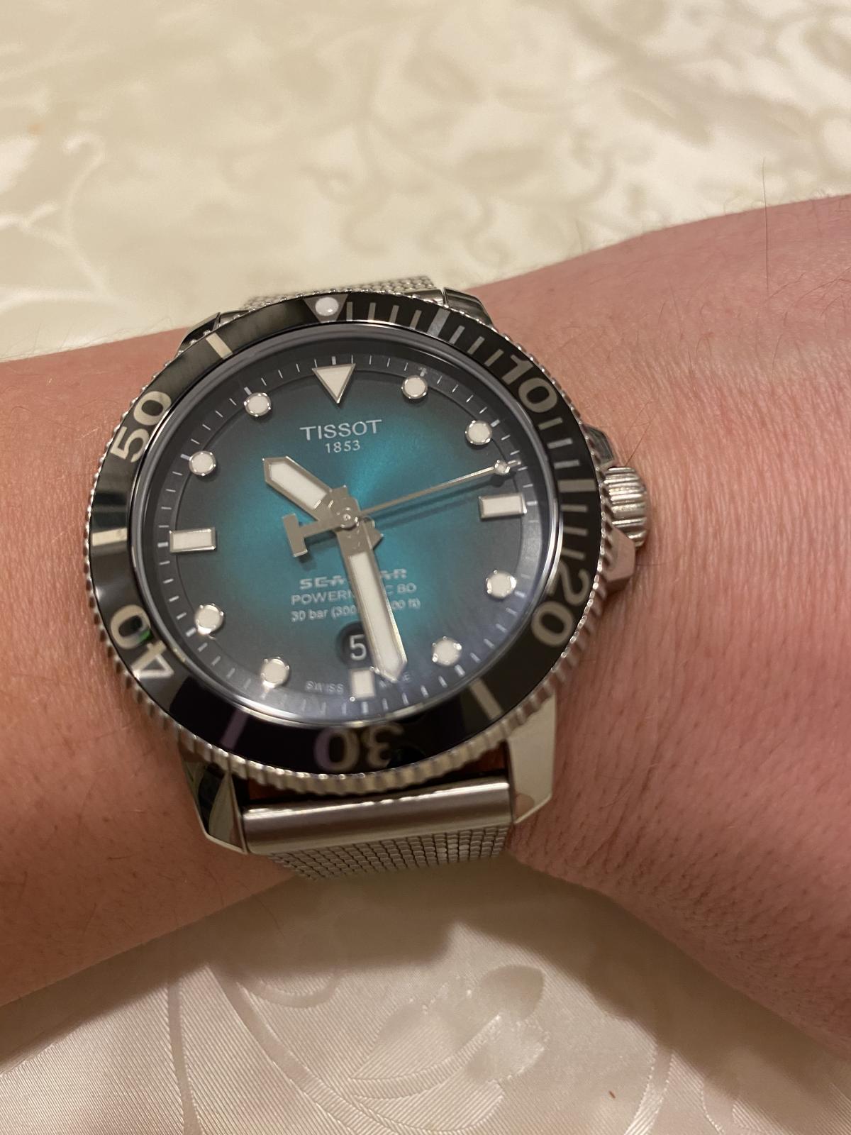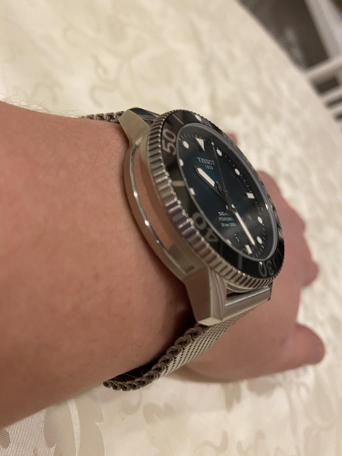 Перед Новым годом стал обладателем часов T120.407.11.091.00 TISSOT SEASTAR 1000 POWERMATIC 80. Всегда отдавал предпочтение дайверским часам, из-за классного внешнего вида, неубиваемости, прекрасного люма и др. Пользовался часами «Восток» ( бочка) и Ориент Рэй-2, но всегда засматривался на данную модель Тиссот. И вот , ознакомившись со всей информацией в интернете, я решился на приобретение данных часов. Хотел именно на миланском браслете из-за отличного внешнего вида, удобства и не большого веса. И так, часы сидят удобно на моем запястье 17,5 см. Не тяжелые ( вес 147 гр. ). Ощущаются комфортно. Зелёный циферблат смотрится просто сногсшибательно. Керамический безель и сапфировое стекло очень красиво отсвечивают и отражают. Безель однонаправленный на 120 кликов. Люм виден всю ночь. Окошко даты легко читается. Несмотря на толщину в 12,7 мм. часы смотрятся очень элегантно. Задняя крышка завинчивающаяся, прозрачная. Погрешность хода на моих часах +1 секунда в сутки, что очень хороший результат для механики. Про механизм Powermatic 80.111 ходят много мнений и слухов по поводу наличия в нём композитных частей в механизме. Кто-то пишет что они пластиковые, что является полным бредом. Ближе к истине то , что данные детали изготовлены из композитного материала на основе карбона, которые гораздо долговечнее металла. Смотрел видео, где люди, имеющие не последнее место в часовом бизнесе сказали , что последние два года в данный механизм устанавливаются только железные части. В любом случае, негативных отзывов о данном мехе не найдено не одного, а он выпущен с 2013 года. Поэтому я уверен , что данные часы прослужат не одно десятилетие верой и правдой. Подводя итог хочу сказать ,что часы просто великолепны во всех аспектах. А покупать их или нет, это уже дело каждого.