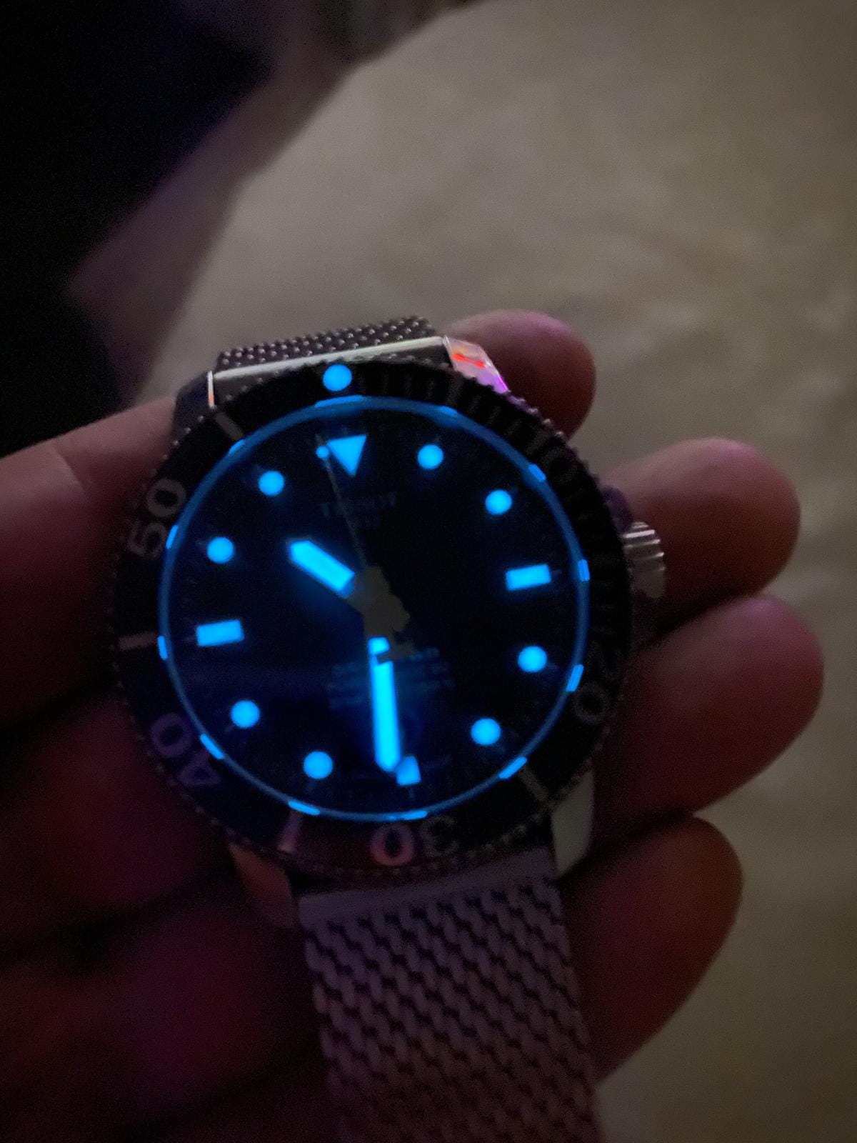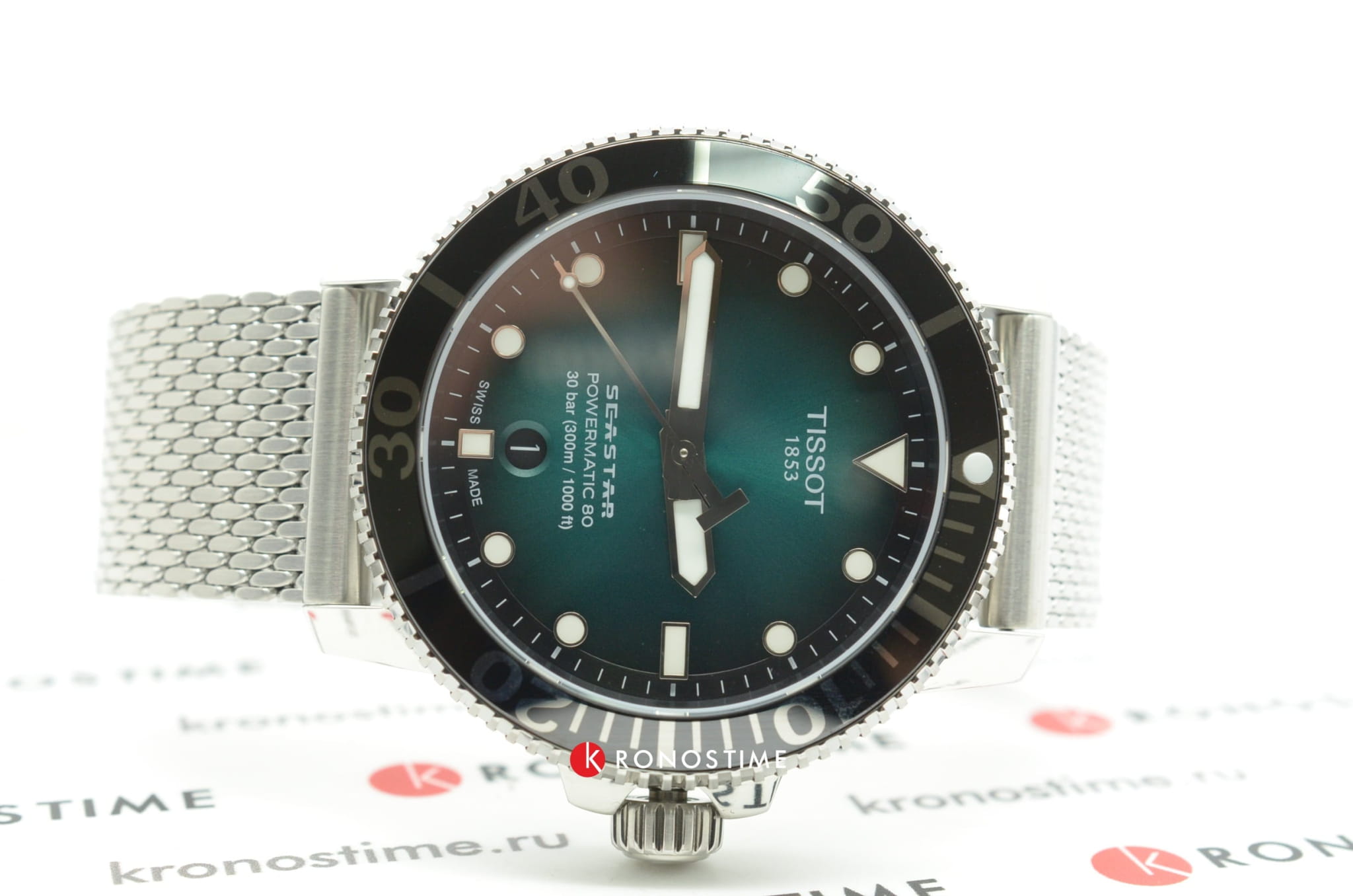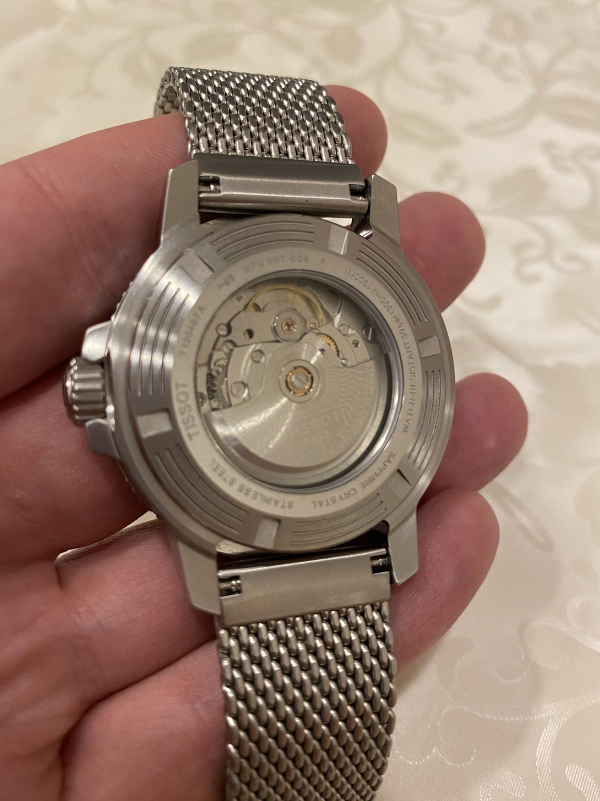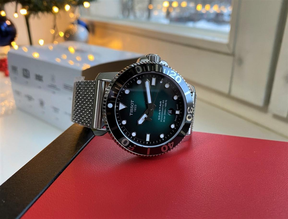 Перед Новым годом стал обладателем часов T120.407.11.091.00 TISSOT SEASTAR 1000 POWERMATIC 80. Всегда отдавал предпочтение дайверским часам, из-за классного внешнего вида, неубиваемости, прекрасного люма и др. Пользовался часами «Восток» ( бочка) и Ориент Рэй-2, но всегда засматривался на данную модель Тиссот. И вот , ознакомившись со всей информацией в интернете, я решился на приобретение данных часов. Хотел именно на миланском браслете из-за отличного внешнего вида, удобства и не большого веса. И так, часы сидят удобно на моем запястье 17,5 см. Не тяжелые ( вес 147 гр. ). Ощущаются комфортно. Зелёный циферблат смотрится просто сногсшибательно. Керамический безель и сапфировое стекло очень красиво отсвечивают и отражают. Безель однонаправленный на 120 кликов. Люм виден всю ночь. Окошко даты легко читается. Несмотря на толщину в 12,7 мм. часы смотрятся очень элегантно. Задняя крышка завинчивающаяся, прозрачная. Погрешность хода на моих часах +1 секунда в сутки, что очень хороший результат для механики. Про механизм Powermatic 80.111 ходят много мнений и слухов по поводу наличия в нём композитных частей в механизме. Кто-то пишет что они пластиковые, что является полным бредом. Ближе к истине то , что данные детали изготовлены из композитного материала на основе карбона, которые гораздо долговечнее металла. Смотрел видео, где люди, имеющие не последнее место в часовом бизнесе сказали , что последние два года в данный механизм устанавливаются только железные части. В любом случае, негативных отзывов о данном мехе не найдено не одного, а он выпущен с 2013 года. Поэтому я уверен , что данные часы прослужат не одно десятилетие верой и правдой. Подводя итог хочу сказать ,что часы просто великолепны во всех аспектах. А покупать их или нет, это уже дело каждого.