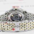 Аксессуар сочетает три оттенка: серебристый, белый, золотой, последний наносится с помощью PVD-покрытияPVDУльтратонкое покрытие наносится в технике вакуумного напыления, сочетает в себе нитрид титана особой прочности со слоем золота или оксида хрома. Несёт в себе декоративную или защитную функцию.. Компактный циферблат с утончённым узором имеет небольшое отверстие - сквозь него можно смотреть, как движутся детали. Механические часы с автоподзаводом обладают механизмом Powermatic 80Powermatic 80Эксклюзивный калибр от швейцарской компании ETA с увеличенным запасом хода до 80 часов за счёт удлинённой заводной пружины. Характеризуется улучшенной системой спуска со сниженным трением., его запас хода увеличен до 80 часов. Корпус и браслет из стали с антикоррозионными свойствами. Сапфировое стекло. Водонепроницаемость до 3 бар. Габариты: 40 x 40 x 9,4 мм.