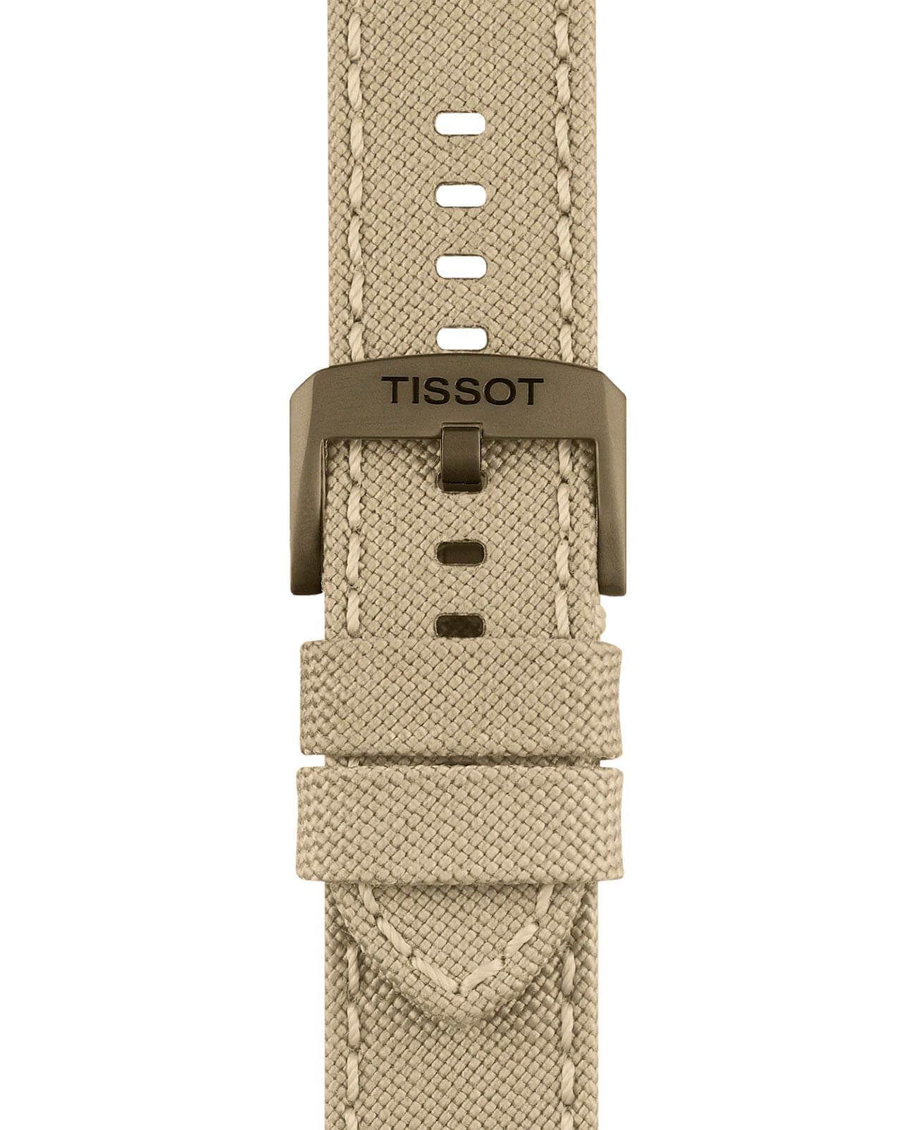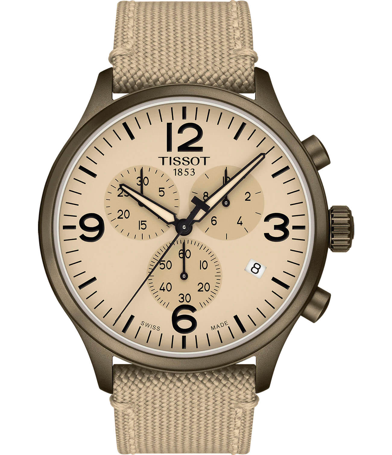 Модель выполнена в лаконичном бежевом цвете, исключение составляет PVD-покрытиеPVDУльтратонкое покрытие наносится в технике вакуумного напыления, сочетает в себе нитрид титана особой прочности со слоем золота или оксида хрома. Несёт в себе декоративную или защитную функцию. корпуса оттенка хаки. Циферблат дополнен арабскими цифрами и миниатюрными счётчиками хронографа. Тканевый ремешок красиво смотрится на запястье, материал обеспечивает комфортное ношение. Высокоточный кварцевый механизм ETA G10.212. Водонепроницаемость при давлении 10 бар. Люминесцентная подсветкаЛюминесцентное покрытиеПозволяет считывать показания времени в темноте. Производители наносят на стрелки, часовые индексы, безель или поверхность циферблата светонакопительный состав, дающий холодное свечение. стрелок. ХронографХронографФункция позволяет измерять отрезки времени с особой точностью: часы, минуты, секунды. Верным признаком хронографа является наличие на циферблате 3 дополнительных окошек-счётчиков., секундомер, отображение текущего числа. Габариты: 45 x 45 x 11 мм.