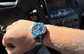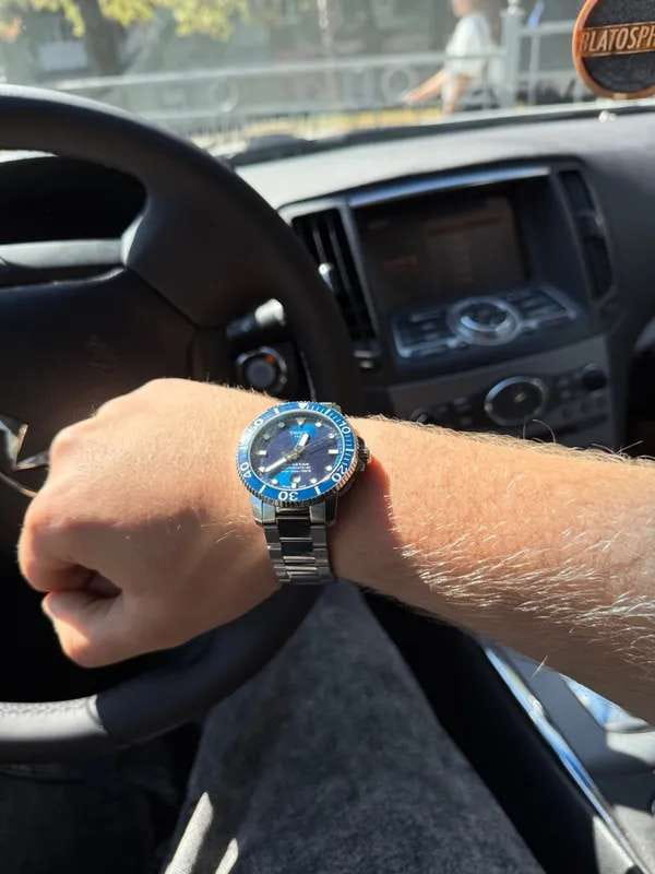 На фоне серебристого браслета и темного безеляБезельВнешний ободок, закрепляющий стекло. В спортивных часах так называется поворотное кольцо с делениями на циферблате, выполняет роль таймера – замеряет отрезки времени на шкале. Неподвижный безель – элемент декора. Однонаправленно вращающийся безель на дайверских часах позволяет фиксировать моменты погружения и выныривания на поверхность. ярко выделяется синий циферблат, отлично видны серебристые стрелки и часовые метки с люминесцентным покрытиемЛюминесцентное покрытиеПозволяет считывать показания времени в темноте. Производители наносят на стрелки, часовые индексы, безель или поверхность циферблата светонакопительный состав, дающий холодное свечение.. Механические часы с автоподзаводом оснащены швейцарским механизмом Powermatic 80Powermatic 80Эксклюзивный калибр от швейцарской компании ETA с увеличенным запасом хода до 80 часов за счёт удлинённой заводной пружины. Характеризуется улучшенной системой спуска со сниженным трением. с запасом хода 80 часов. Завинчивающиеся кнопки, головка, прозрачная задняя крышка. Сапфировое стекло. Апертура даты. Габариты: 43 x 43 x 12,7 мм.