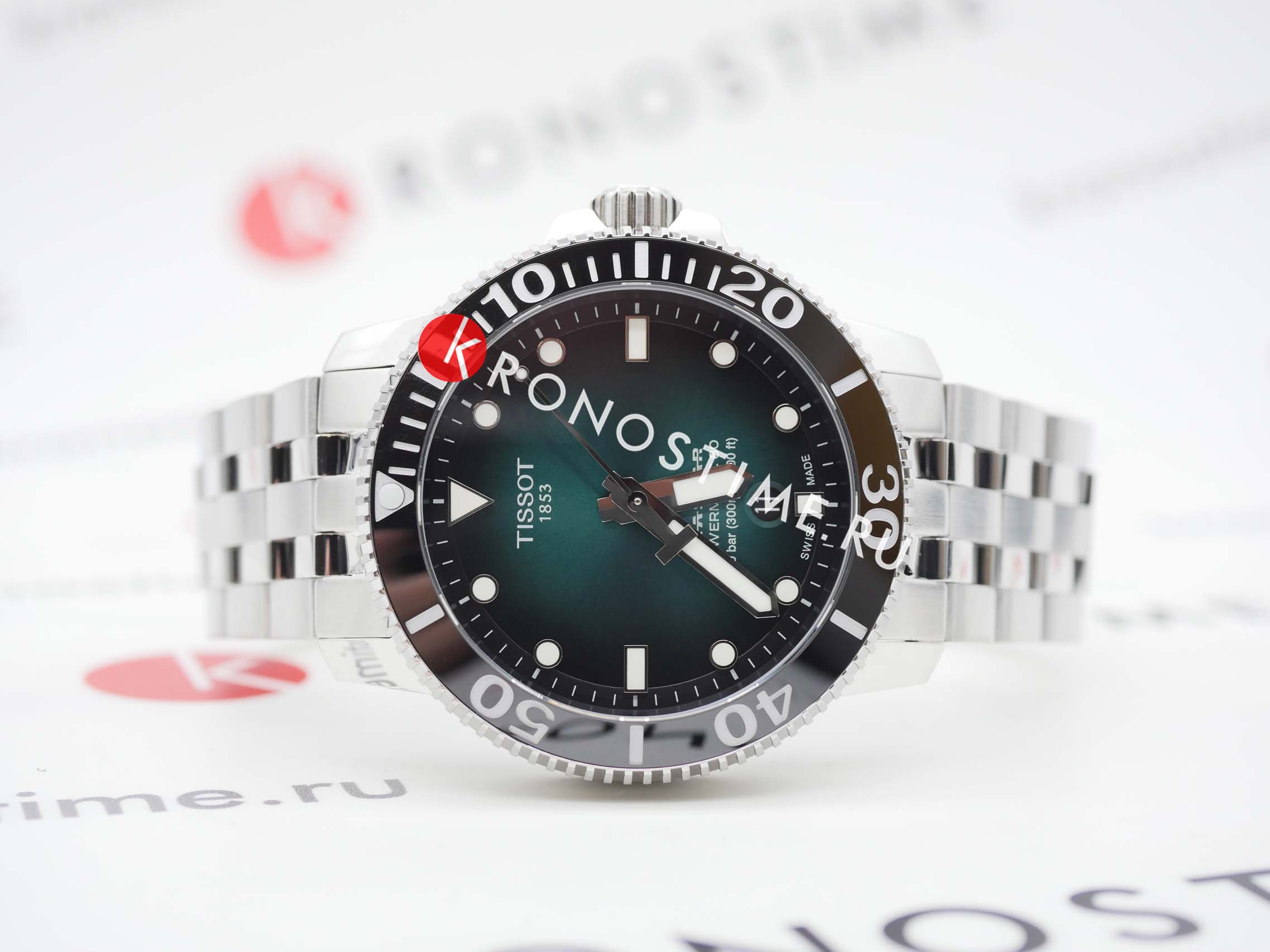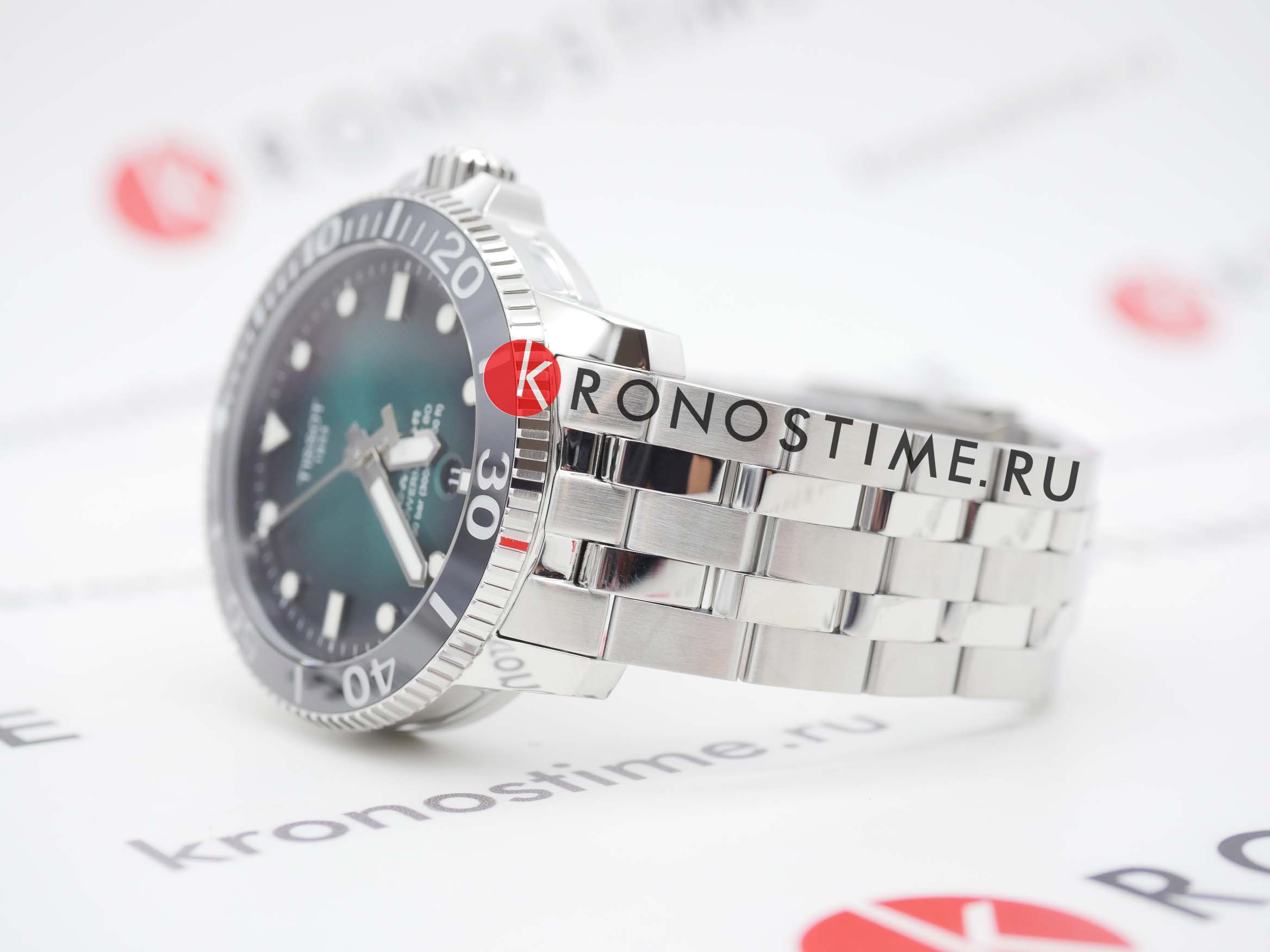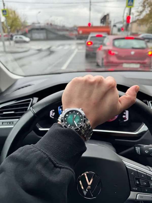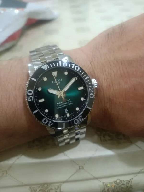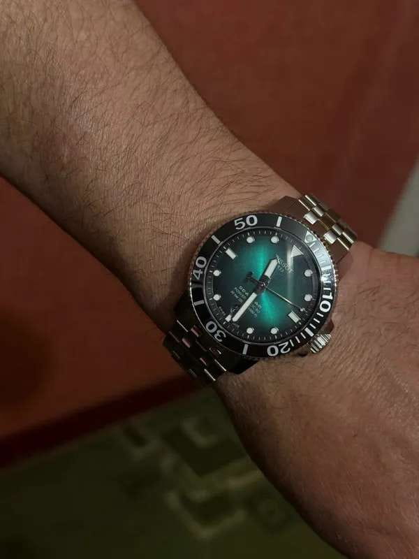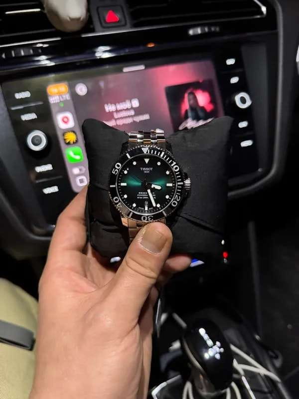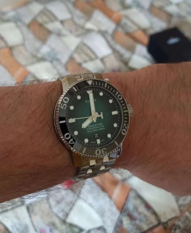 Это превосходная модель с запоминающимся дизайном, основанная на точном и надёжном механизме. Часы оснащены сапфировым стеклом, керамической вставкой на безеле и обладают серьёзным уровнем водозащиты. За первые 24 часа наблюдения точность хода составила +1 секунду. Среди всей линейки Seastar этот вариант с градиентным зелёным циферблатом очень выделяется. Экземпляр пришёл в заводских защитных плёнках, без малейших следов носки или постороннего вмешательства. Серийный номер на крышке не повреждён, и часы успешно прошли регистрацию на официальном сайте Tissot. Комплект полный: фирменная коробка, инструкция и гарантийный талон.
