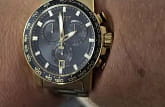 Современный хронографХронографФункция позволяет измерять отрезки времени с особой точностью: часы, минуты, секунды. Верным признаком хронографа является наличие на циферблате 3 дополнительных окошек-счётчиков. поможет подчеркнуть продуманный образ делового мужчины. Модель выполнена в чёрной-белой расцветке. Наручные часы функционируют благодаря швейцарскому кварцевому механизму ETA G10.212. Калибр отличается максимальной точностью хода. Стекло из сапфира. Водостойкость 100 метров. Надёжный корпус из антикоррозионной стали 316L с золотистым PVD-покрытиемPVDУльтратонкое покрытие наносится в технике вакуумного напыления, сочетает в себе нитрид титана особой прочности со слоем золота или оксида хрома. Несёт в себе декоративную или защитную функцию.. Люминесцентная подсветкаЛюминесцентное покрытиеПозволяет считывать показания времени в темноте. Производители наносят на стрелки, часовые индексы, безель или поверхность циферблата светонакопительный состав, дающий холодное свечение. стрелок и индексов. Секундомер, отображение даты. Диаметр корпуса: 45,5 мм.