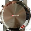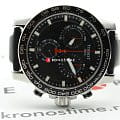 Современный хронографХронографФункция позволяет измерять отрезки времени с особой точностью: часы, минуты, секунды. Верным признаком хронографа является наличие на циферблате 3 дополнительных окошек-счётчиков. поможет подчеркнуть продуманный образ делового мужчины. Модель выполнена в спокойной серебристо-чёрной расцветке, исключение – ярко-красные стрелки, измеряющие секунды. Спортивный дух выражается в ремешке из натуральной кожи с прострочкой, чёрном безелеБезельВнешний ободок, закрепляющий стекло. В спортивных часах так называется поворотное кольцо с делениями на циферблате, выполняет роль таймера – замеряет отрезки времени на шкале. Неподвижный безель – элемент декора. Однонаправленно вращающийся безель на дайверских часах позволяет фиксировать моменты погружения и выныривания на поверхность. со шкалой тахиметраТахиметрРазмеченная шкала, располагается на ободке или безеле часов. Тахиметр позволяет рассчитать скорость на определённом участке пути, расстояние измеряется в километрах или милях.. Наручные часы функционируют благодаря швейцарскому кварцевому механизму ETA G10.212. Калибр отличается максимальной точностью хода. Стекло из сапфира. Водостойкость 100 метров. Надёжный корпус из антикоррозионной стали 316L. Люминесцентная подсветкаЛюминесцентное покрытиеПозволяет считывать показания времени в темноте. Производители наносят на стрелки, часовые индексы, безель или поверхность циферблата светонакопительный состав, дающий холодное свечение. стрелок и индексов. Секундомер, отображение даты. Диаметр корпуса: 45,5 мм.