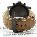 Современный хронографХронографФункция позволяет измерять отрезки времени с особой точностью: часы, минуты, секунды. Верным признаком хронографа является наличие на циферблате 3 дополнительных окошек-счётчиков. поможет подчеркнуть продуманный образ делового мужчины. Модель выполнена в спокойной тёмной расцветке. Спортивный дух выражается в коричневом ремешке из натуральной кожи с прострочкой, чёрном безелеБезельВнешний ободок, закрепляющий стекло. В спортивных часах так называется поворотное кольцо с делениями на циферблате, выполняет роль таймера – замеряет отрезки времени на шкале. Неподвижный безель – элемент декора. Однонаправленно вращающийся безель на дайверских часах позволяет фиксировать моменты погружения и выныривания на поверхность. со шкалой тахиметраТахиметрРазмеченная шкала, располагается на ободке или безеле часов. Тахиметр позволяет рассчитать скорость на определённом участке пути, расстояние измеряется в километрах или милях.. Наручные часы функционируют благодаря швейцарскому кварцевому механизму ETA G10.212. Калибр отличается максимальной точностью хода. Стекло из сапфира. Водостойкость 100 метров. Надёжный корпус из антикоррозионной стали 316L с чёрным PVD-покрытиемPVDУльтратонкое покрытие наносится в технике вакуумного напыления, сочетает в себе нитрид титана особой прочности со слоем золота или оксида хрома. Несёт в себе декоративную или защитную функцию.. Люминесцентная подсветкаЛюминесцентное покрытиеПозволяет считывать показания времени в темноте. Производители наносят на стрелки, часовые индексы, безель или поверхность циферблата светонакопительный состав, дающий холодное свечение. стрелок и индексов. Секундомер, отображение даты. Диаметр корпуса: 45,5 мм.