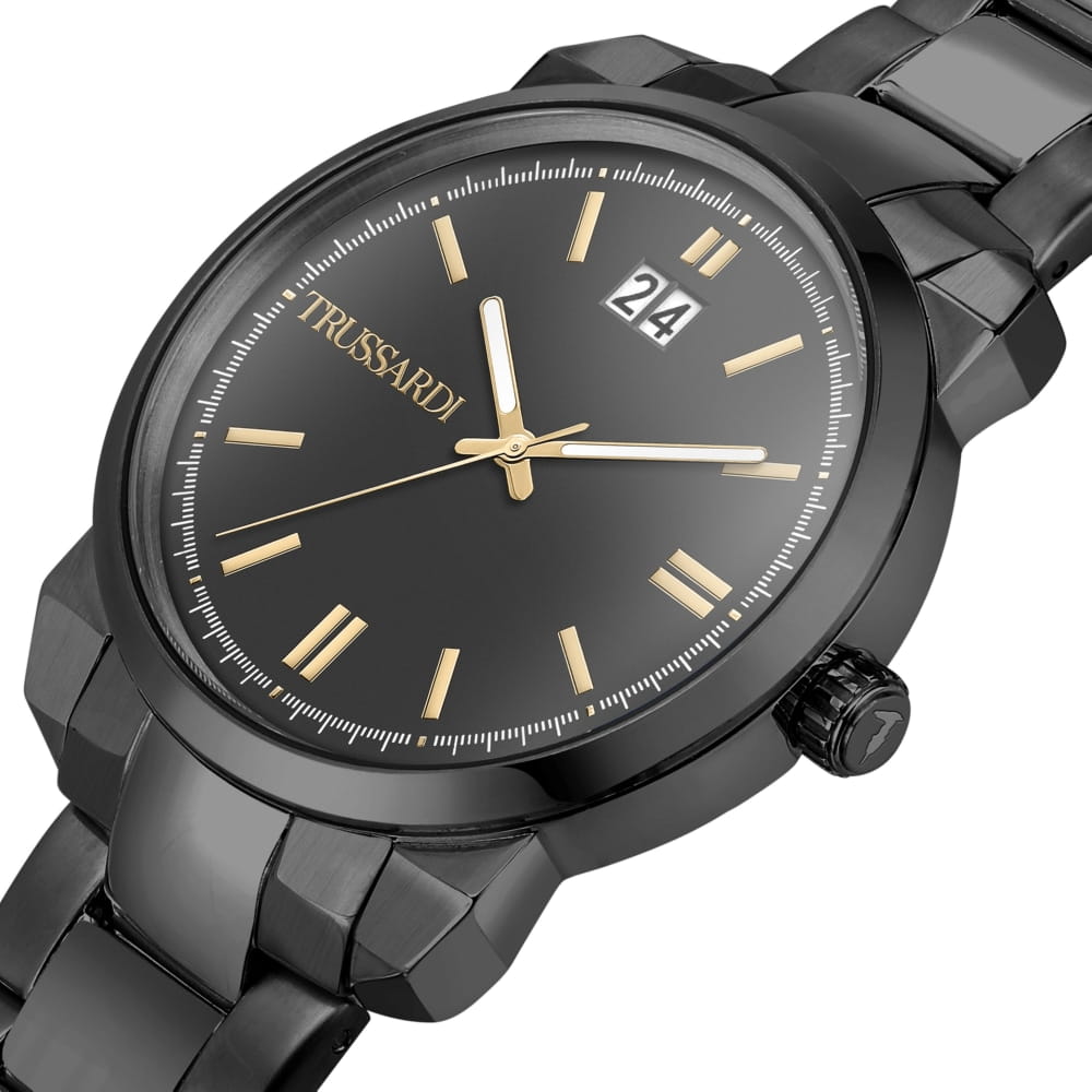 Итальянские мужские часы Trussardi T-City R2453154004 - это стильный мужской аксессуар, который сочетает элегантный дизайн и практичность. Корпус выполнен из нержавеющей стали с IP-покрытиемIP-покрытиеМетод ионного напыления. Демонстрирует повышенную устойчивость к истиранию, окислению и химическим веществам. Под воздействием высокого давления и температуры около 1500°C молекулы металла надёжно соединяются с частицами корпуса часов., что обеспечивает долговечность и утончённый внешний вид. Надежное минеральное стеклоМинеральное стеклоМинеральное стекло представляет собой искусственно выращенный минерал кварца. Такое стекло отличается особой устойчивостью к повреждениям и царапинам. Уступает по некоторым качествам сапфировому стеклу. защищает циферблат от царапин и обеспечивает долговечность. Модель оснащена кварцевым механизмом, обеспечивающим высокую точность хода. Браслет из нержавеющей стали с IP-покрытиемIP-покрытиеМетод ионного напыления. Демонстрирует повышенную устойчивость к истиранию, окислению и химическим веществам. Под воздействием высокого давления и температуры около 1500°C молекулы металла надёжно соединяются с частицами корпуса часов.  с раскладной застёжкойРаскладная застёжкаТакой тип застёжки используется только на браслетах из металла. Она никогда не раскрывается полностью, происходит разделение на 2 и более частей. Раскладывающая застёжка снизит вероятность потери часов к минимуму. обеспечивает комфортное ношение. Водозащита 50 метров позволит защитить корпус от случайных брызг или капель дождя. Стрелки оснащены люминесцентным покрытиемЛюминесцентное покрытиеПозволяет считывать показания времени в темноте. Производители наносят на стрелки, часовые индексы, безель или поверхность циферблата светонакопительный состав, дающий холодное свечение., обеспечивающим отличную видимость даже при слабом освещении. Окошко даты в положении 12 часов. Эта модель – отличный выбор для тех, кто ищет сочетание стиля, качества и функциональности. Часы станут не только полезным аксессуаром, но и выразительным элементом вашего имиджа.