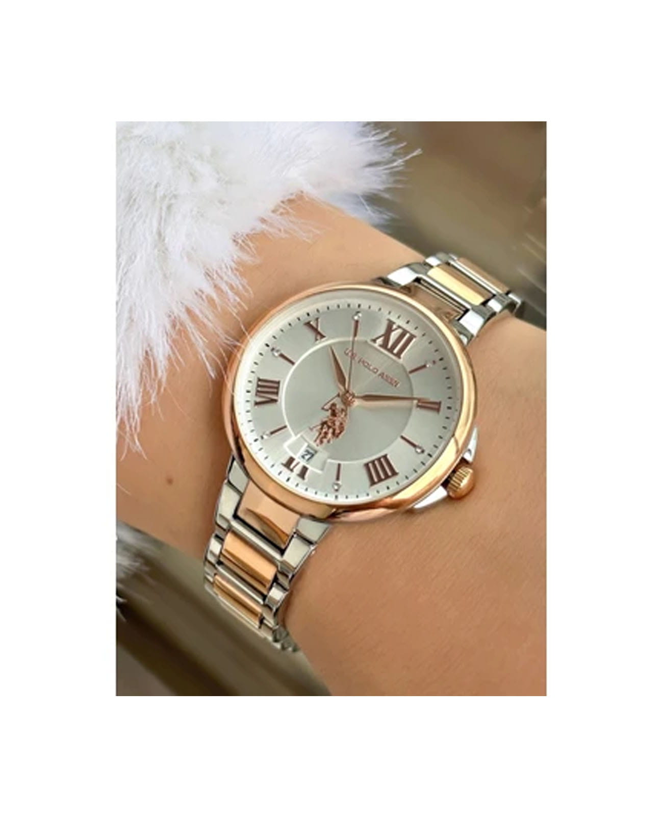 Женские часы U.S. Polo Assn Stile USPA2012-04 кварцевый механизм с высокой точностью. Минеральное стеклоМинеральное стеклоМинеральное стекло представляет собой искусственно выращенный минерал кварца. Такое стекло отличается особой устойчивостью к повреждениям и царапинам. Уступает по некоторым качествам сапфировому стеклу. устойчивое к появлению царапин, обладающее высокой прозрачностью. Корпус часов изготовлен из нержавеющей стали. БезельБезельВнешний ободок, закрепляющий стекло. В спортивных часах так называется поворотное кольцо с делениями на циферблате, выполняет роль таймера – замеряет отрезки времени на шкале. Неподвижный безель – элемент декора. Однонаправленно вращающийся безель на дайверских часах позволяет фиксировать моменты погружения и выныривания на поверхность. с IP-покрытиемIP-покрытиеМетод ионного напыления. Демонстрирует повышенную устойчивость к истиранию, окислению и химическим веществам. Под воздействием высокого давления и температуры около 1500°C молекулы металла надёжно соединяются с частицами корпуса часов.. Циферблат украшен кристаллами. Окошко даты находится в положении 6 часов. Класс водозащиты: 50 метров, позволит защитить корпус от случайных брызг или капель дождя. Стальной браслет с частичным IP-покрытиемIP-покрытиеМетод ионного напыления. Демонстрирует повышенную устойчивость к истиранию, окислению и химическим веществам. Под воздействием высокого давления и температуры около 1500°C молекулы металла надёжно соединяются с частицами корпуса часов. на ювелирной застежке.