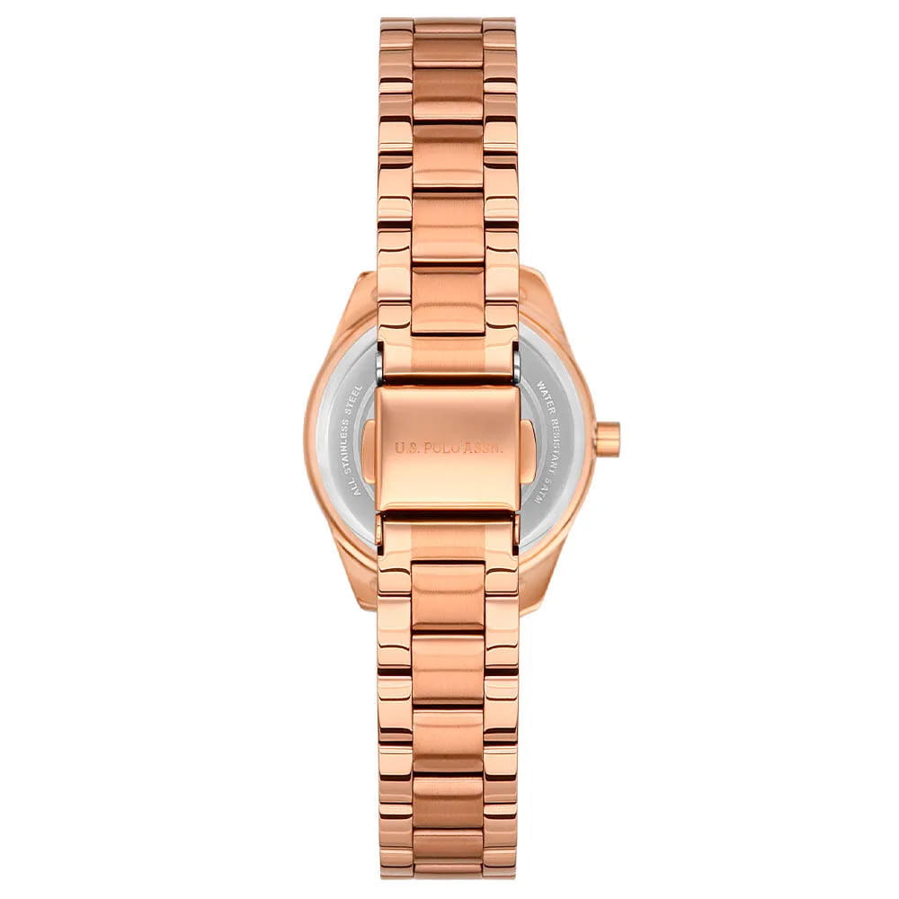 Женские элегантные часы U.S. Polo Assn. Stile USPA2064-02, кварцевый механизм с высокой точностью. Минеральное стеклоМинеральное стеклоМинеральное стекло представляет собой искусственно выращенный минерал кварца. Такое стекло отличается особой устойчивостью к повреждениям и царапинам. Уступает по некоторым качествам сапфировому стеклу. устойчивое к появлению царапин, обладающее высокой прозрачностью. Изысканный корпус изготовлен из нержавеющей стали с IP-покрытиемIP-покрытиеМетод ионного напыления. Демонстрирует повышенную устойчивость к истиранию, окислению и химическим веществам. Под воздействием высокого давления и температуры около 1500°C молекулы металла надёжно соединяются с частицами корпуса часов., а безельБезельВнешний ободок, закрепляющий стекло. В спортивных часах так называется поворотное кольцо с делениями на циферблате, выполняет роль таймера – замеряет отрезки времени на шкале. Неподвижный безель – элемент декора. Однонаправленно вращающийся безель на дайверских часах позволяет фиксировать моменты погружения и выныривания на поверхность. украшен кристаллами. Лаконичные золотистые центральные часовая, минутная и секундная стрелки. Класс водозащиты: 50 метров, позволит защитить корпус от случайных брызг или капель дождя. Стальной браслет с IP-покрытиемIP-покрытиеМетод ионного напыления. Демонстрирует повышенную устойчивость к истиранию, окислению и химическим веществам. Под воздействием высокого давления и температуры около 1500°C молекулы металла надёжно соединяются с частицами корпуса часов. на раскладной застёжкеРаскладная застёжкаТакой тип застёжки используется только на браслетах из металла. Она никогда не раскрывается полностью, происходит разделение на 2 и более частей. Раскладывающая застёжка снизит вероятность потери часов к минимуму. обеспечивает комфорт и удобство в использовании, добавляя завершающий штрих к этому стильному аксессуару. Циферблат подчёркивает изысканный характер часов, создавая универсальный образ, подходящий как для повседневных ситуаций, так и для особых случаев.