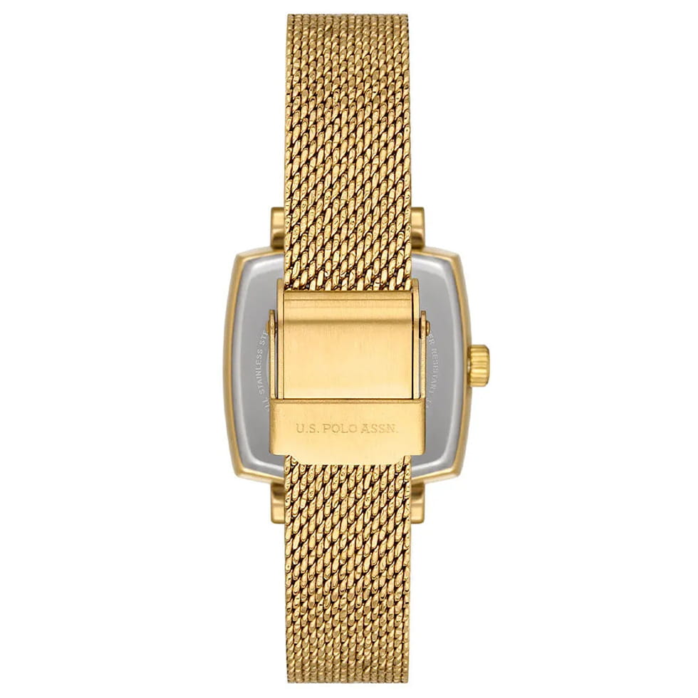 Женские наручные часы U.S. Polo Assn. Stile USPA2066-04 — это стильный и лаконичный аксессуар, выполненный в форме квадрата. Модель изготовлена из стали с PVD-покрытиемPVDУльтратонкое покрытие наносится в технике вакуумного напыления, сочетает в себе нитрид титана особой прочности со слоем золота или оксида хрома. Несёт в себе декоративную или защитную функцию. цвета желтого золота, придающий благородный внешний вид и устойчивость к царапинам. Циферблат зеленого цвета дополнен секундной стрелкой, обеспечивающей точность отсчёта времени. Защиту циферблата обеспечивает минеральное стеклоМинеральное стеклоМинеральное стекло представляет собой искусственно выращенный минерал кварца. Такое стекло отличается особой устойчивостью к повреждениям и царапинам. Уступает по некоторым качествам сапфировому стеклу., устойчивое к мелким повреждениям. Часы оснащены кварцевым механизмом, гарантирующим точность и минимальное обслуживание. Водонепроницаемость 3 АТМ позволяет использовать часы в повседневных условиях — при мытье рук или под лёгким дождём. Браслет выполнен в технике миланской сетки из стали с PVD-покрытиемPVDУльтратонкое покрытие наносится в технике вакуумного напыления, сочетает в себе нитрид титана особой прочности со слоем золота или оксида хрома. Несёт в себе декоративную или защитную функцию. и оснащён раскладным замкомРаскладной замокДанный вариант застежки используется только на часах с металлическим браслетом. Отличительная особенность такого крепления в том, что длина браслета становится универсальной и вы можете самостоятельно отрегулировать нужный вам размер – застежка просто двигается по браслету часов., обеспечивающей комфорт и уверенную фиксацию на запястье. Толщина корпуса составляет 10 мм, а его размер 26 мм, что делает часы компактными и удобными в носке. Эти часы станут универсальным аксессуаром для уверенных в себе женщин, которые ценят сочетание стиля, качества и эстетики — идеальный выбор для повседневного образа и торжественных случаев.