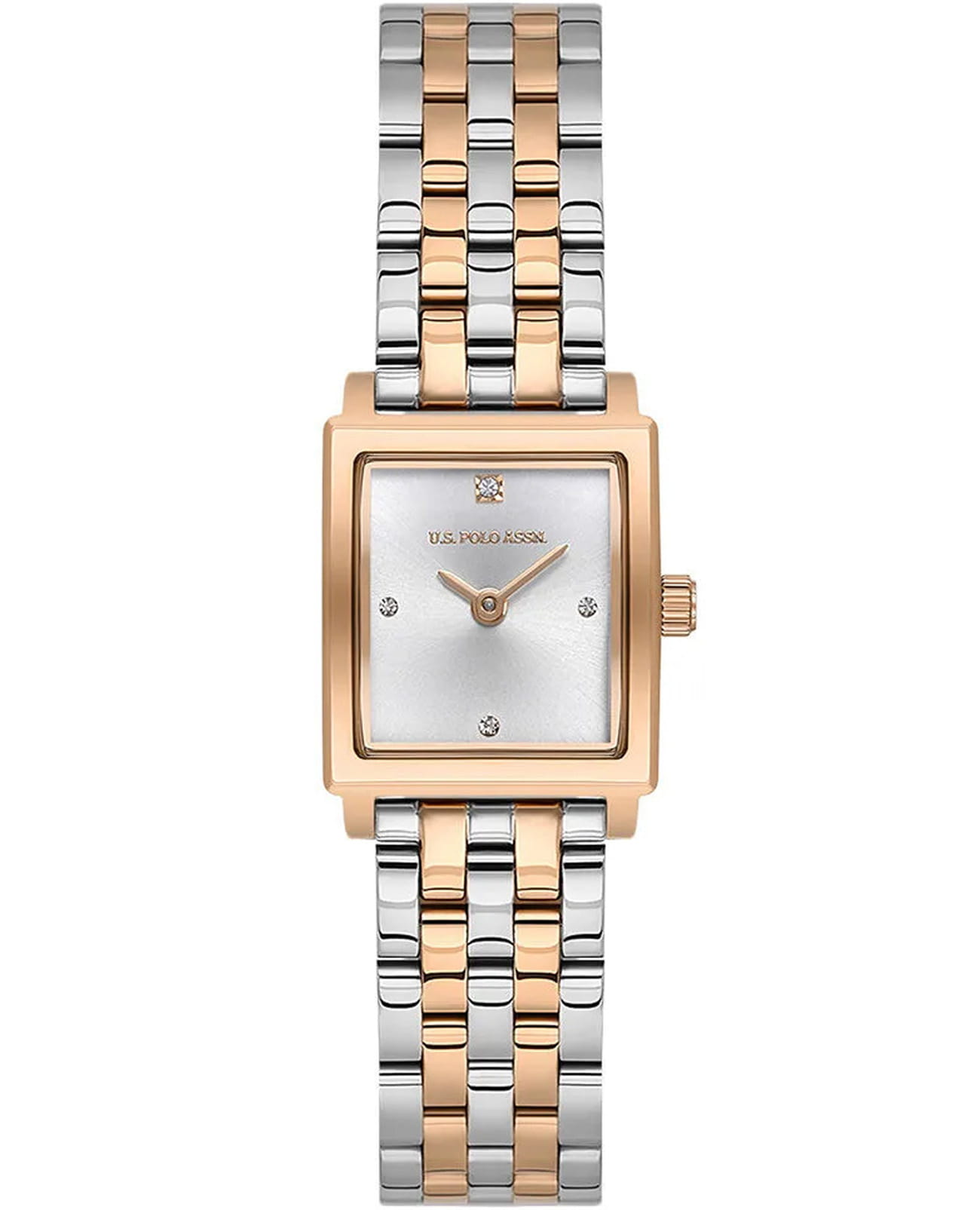 Женские наручные часы U.S. Polo Assn. Stile USPA2107-03 — это стильный и лаконичный аксессуар, выполненный в форме квадрата. Модель изготовлена из стали с IP-покрытиемIP-покрытиеМетод ионного напыления. Демонстрирует повышенную устойчивость к истиранию, окислению и химическим веществам. Под воздействием высокого давления и температуры около 1500°C молекулы металла надёжно соединяются с частицами корпуса часов., придающий благородный внешний вид и устойчивость к царапинам. Циферблат с кристаллами дополнен лаконичными центральными часовой и минутной стрелками. Защиту циферблата обеспечивает минеральное стеклоМинеральное стеклоМинеральное стекло представляет собой искусственно выращенный минерал кварца. Такое стекло отличается особой устойчивостью к повреждениям и царапинам. Уступает по некоторым качествам сапфировому стеклу., устойчивое к мелким повреждениям. Часы оснащены кварцевым механизмом, гарантирующим точность и минимальное обслуживание. Водонепроницаемость 3 АТМ позволяет использовать часы в повседневных условиях — при мытье рук или под лёгким дождём. Браслет выполнен из стали с IP-покрытиемIP-покрытиеМетод ионного напыления. Демонстрирует повышенную устойчивость к истиранию, окислению и химическим веществам. Под воздействием высокого давления и температуры около 1500°C молекулы металла надёжно соединяются с частицами корпуса часов. и оснащён раскладной застёжкойРаскладная застёжкаТакой тип застёжки используется только на браслетах из металла. Она никогда не раскрывается полностью, происходит разделение на 2 и более частей. Раскладывающая застёжка снизит вероятность потери часов к минимуму., обеспечивающей комфорт и уверенную фиксацию на запястье. Толщина корпуса составляет 7 мм, а его размер 19 мм, что делает часы компактными и удобными в носке. Эти часы станут универсальным аксессуаром для уверенных в себе женщин, которые ценят сочетание стиля, качества и эстетики — идеальный выбор для повседневного образа и торжественных случаев.