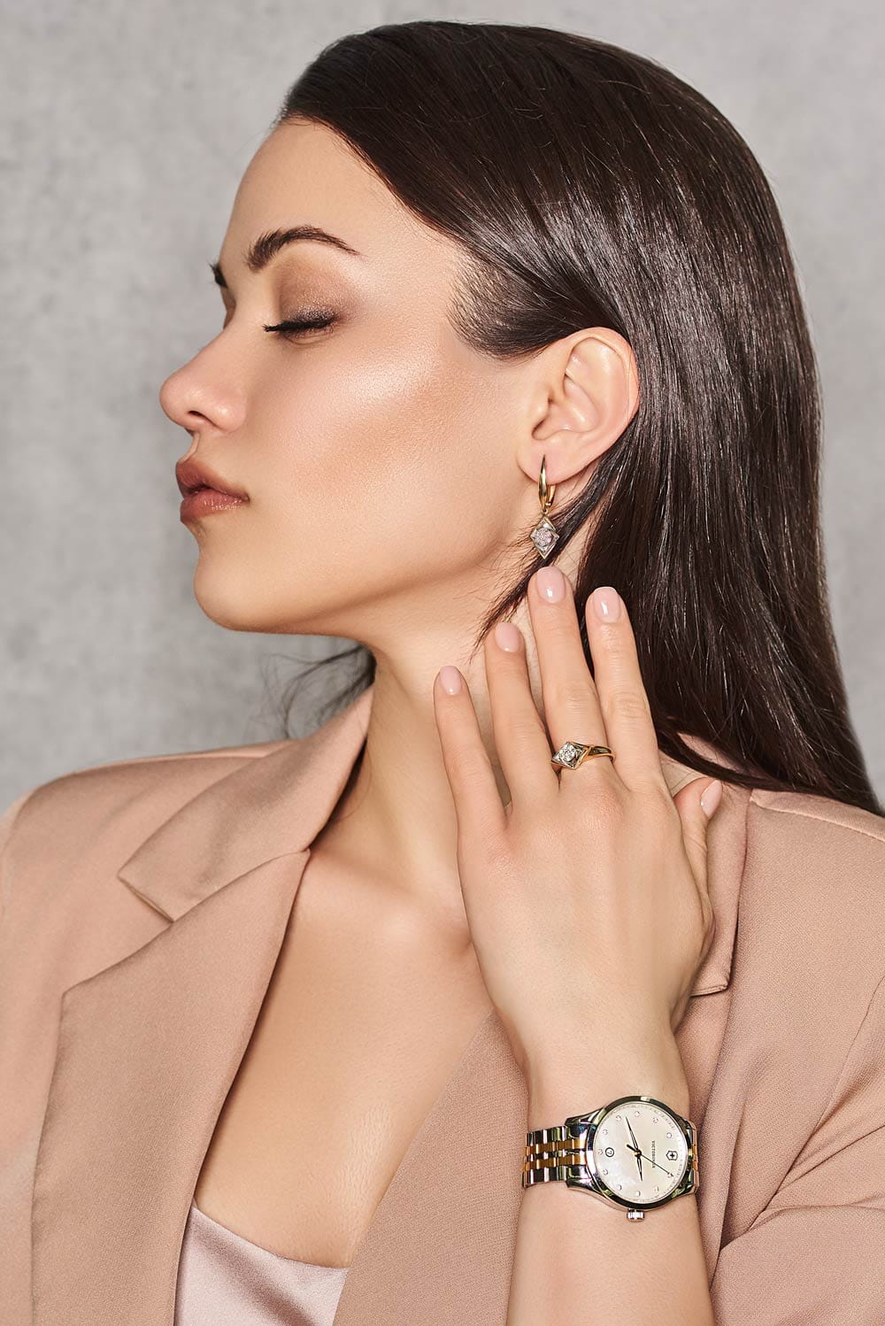 Женские швейцарские часы Victorinox 241831 выполнены в сдержанном функциональном формате без акцента на декор. Корпус из нержавеющей стали диаметром 35 мм подходит для постоянного ношения и не утяжеляет посадку на запястье. Циферблат с сапфировым стекломСапфировое стеклоПрочный и надёжный материал из кристалла сапфира синтетического происхождения, характеризующийся особой твёрдостью и устойчивостью к царапинам и повреждениям. и тройным антибликовым покрытиемАнтибликовое покрытиеСлой оксида металла в 0,13-0,3 микрон, благодаря которому стекло часов не бликует и не отражает свет. Антибликовое покрытие уменьшает отражение света в 10 раз, обеспечивая отличную читаемость показателей циферблата., что снижает отражения и сохраняет чёткость разметки при ярком освещении. Водозащита 100 метров допускает плавание и активный контакт с водой без использования для глубоких погружений. Стальной браслет с PVD-покрытиемPVDУльтратонкое покрытие наносится в технике вакуумного напыления, сочетает в себе нитрид титана особой прочности со слоем золота или оксида хрома. Несёт в себе декоративную или защитную функцию. оснащён застёжкой-бабочкой с кнопкамиЗастёжка "бабочка"Такой вид застёжки дополняется предохранителями, помогающими избежать случайного раскрытия браслета. Обладают изящным исполнением. , обеспечивающей плотную фиксацию и ровное распределение веса. Стрелки имеют люминесцентное покрытиеЛюминесцентное покрытиеПозволяет считывать показания времени в темноте. Производители наносят на стрелки, часовые индексы, безель или поверхность циферблата светонакопительный состав, дающий холодное свечение., позволяющее считывать время в темноте и при слабом внешнем свете.