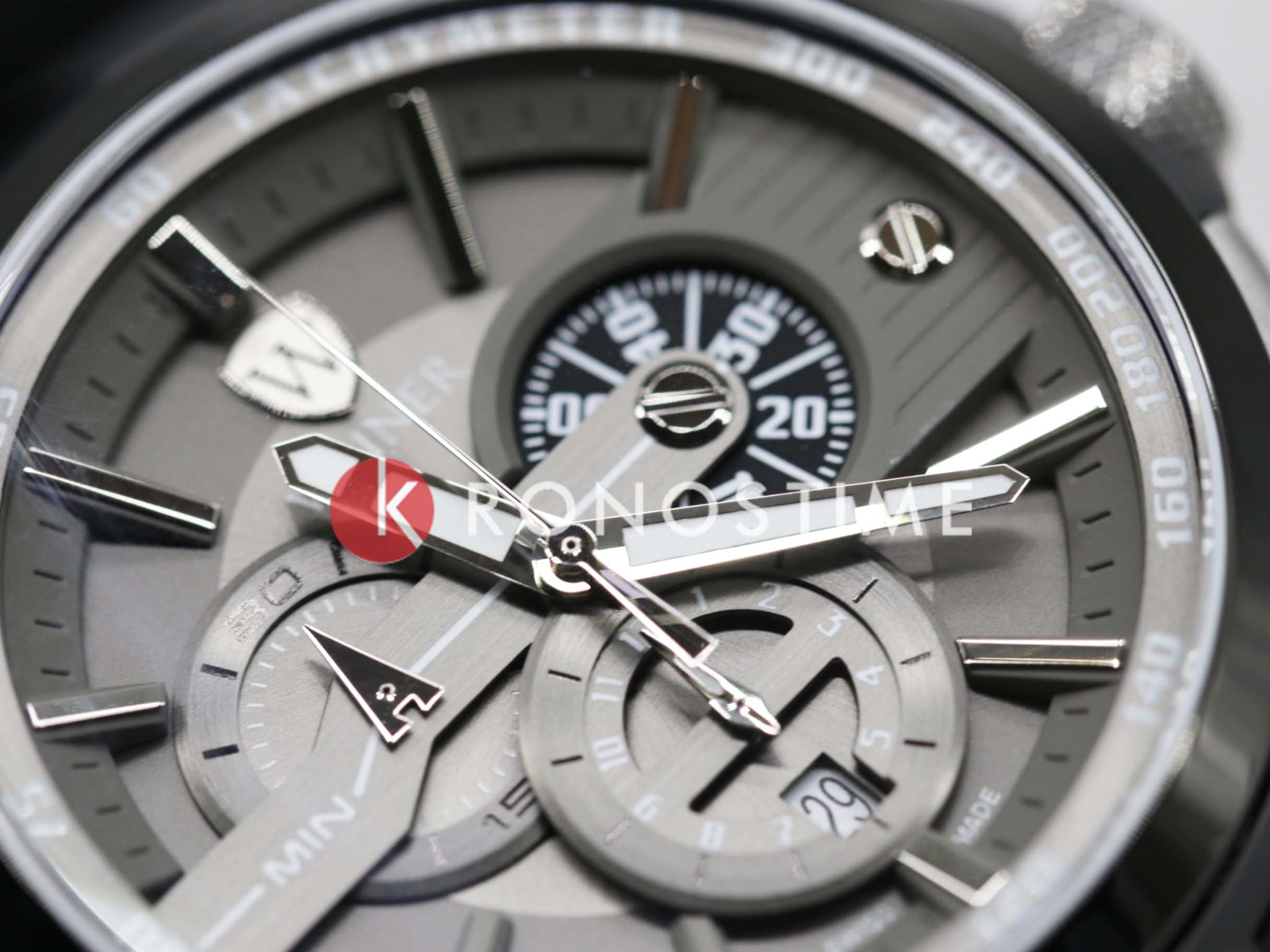Функциональность дополняется хронографомХронографФункция позволяет измерять отрезки времени с особой точностью: часы, минуты, секунды. Верным признаком хронографа является наличие на циферблате 3 дополнительных окошек-счётчиков. для точного измерения времени, тахиметрической шкалойТахиметрРазмеченная шкала, располагается на ободке или безеле часов. Тахиметр позволяет рассчитать скорость на определённом участке пути, расстояние измеряется в километрах или милях. и индикатором даты.