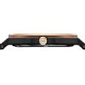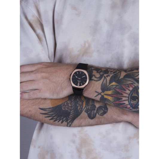 Стальной корпус с PVD-покрытиемPVDУльтратонкое покрытие наносится в технике вакуумного напыления, сочетает в себе нитрид титана особой прочности со слоем золота или оксида хрома. Несёт в себе декоративную или защитную функцию. придает часам прочность и долговечность, а циферблат надежно защищен закаленным минеральным стеклом. Минеральное стеклоМинеральное стеклоМинеральное стекло представляет собой искусственно выращенный минерал кварца. Такое стекло отличается особой устойчивостью к повреждениям и царапинам. Уступает по некоторым качествам сапфировому стеклу., что предотвращает появление царапин и повреждений. БезельБезельВнешний ободок, закрепляющий стекло. В спортивных часах так называется поворотное кольцо с делениями на циферблате, выполняет роль таймера – замеряет отрезки времени на шкале. Неподвижный безель – элемент декора. Однонаправленно вращающийся безель на дайверских часах позволяет фиксировать моменты погружения и выныривания на поверхность. с PVD-покрытиемPVDУльтратонкое покрытие наносится в технике вакуумного напыления, сочетает в себе нитрид титана особой прочности со слоем золота или оксида хрома. Несёт в себе декоративную или защитную функцию..