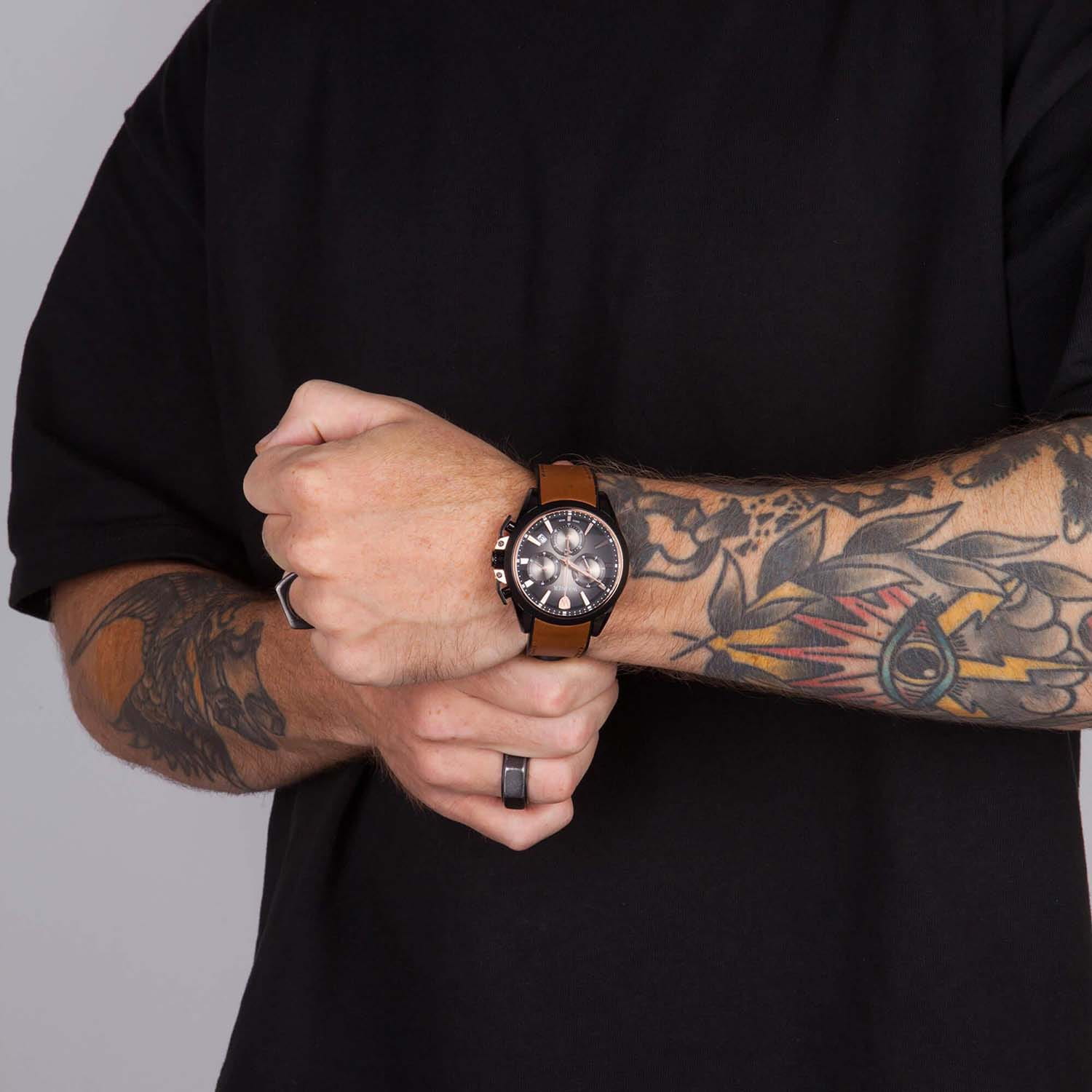 Мужские кварцевые часы-хронографХронографФункция позволяет измерять отрезки времени с особой точностью: часы, минуты, секунды. Верным признаком хронографа является наличие на циферблате 3 дополнительных окошек-счётчиков. с секундомеромСекундомерСекундоме́р — прибор, способный измерять интервалы времени с точностью до долей секунды. Wainer WA.16101-A сочетает элегантный дизайн и высокое качество исполнения. Корпус выполнен из нержавеющей стали с PVD-покрытиемPVDУльтратонкое покрытие наносится в технике вакуумного напыления, сочетает в себе нитрид титана особой прочности со слоем золота или оксида хрома. Несёт в себе декоративную или защитную функцию. черного цвета, диаметром 44 мм и толщиной 11 мм, обеспечивает прочность и долговечность. Циферблат с метками в виде штрихов выполнен по технологии Sunray (солнечные лучи) и украшен фирменным логотипом Wainer. Секундная стрелка на конце декорирована логотипом бренда - буквой W. Сапфировое стеклоСапфировое стеклоПрочный и надёжный материал из кристалла сапфира синтетического происхождения, характеризующийся особой твёрдостью и устойчивостью к царапинам и повреждениям. защищает дисплей от царапин и механических повреждений. Окошко даты находится в положении между отметками 4 и 5 часов. Стрелки с люминесцентным покрытиемЛюминесцентное покрытиеПозволяет считывать показания времени в темноте. Производители наносят на стрелки, часовые индексы, безель или поверхность циферблата светонакопительный состав, дающий холодное свечение., улучшая читаемость в условиях недостаточного освещения. БезельБезельВнешний ободок, закрепляющий стекло. В спортивных часах так называется поворотное кольцо с делениями на циферблате, выполняет роль таймера – замеряет отрезки времени на шкале. Неподвижный безель – элемент декора. Однонаправленно вращающийся безель на дайверских часах позволяет фиксировать моменты погружения и выныривания на поверхность. с PVD-покрытиемPVDУльтратонкое покрытие наносится в технике вакуумного напыления, сочетает в себе нитрид титана особой прочности со слоем золота или оксида хрома. Несёт в себе декоративную или защитную функцию. золотисто-черного цвета. Кожаный ремешок на силиконовой основе и стандартной застёжкой обеспечивает комфортное ношение. Водонепроницаемость до 100 метров делает модель подходящей для плавания и активного образа жизни. Wainer — это стильный и надежный аксессуар для тех, кто ценит швейцарское качество и современные технологии.