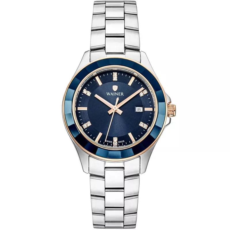 Стальной корпус круглой формы выполнен из нержавеющей стали марки 316L, что придает часам премиальный внешний вид и делает их устойчивыми к механическим повреждениям. Циферблат украшен фирменным логотипом Wainer и накладными метками в виде штрихов, чередующимися с блестящими цирконами, добавляющими особую роскошь и шарм.