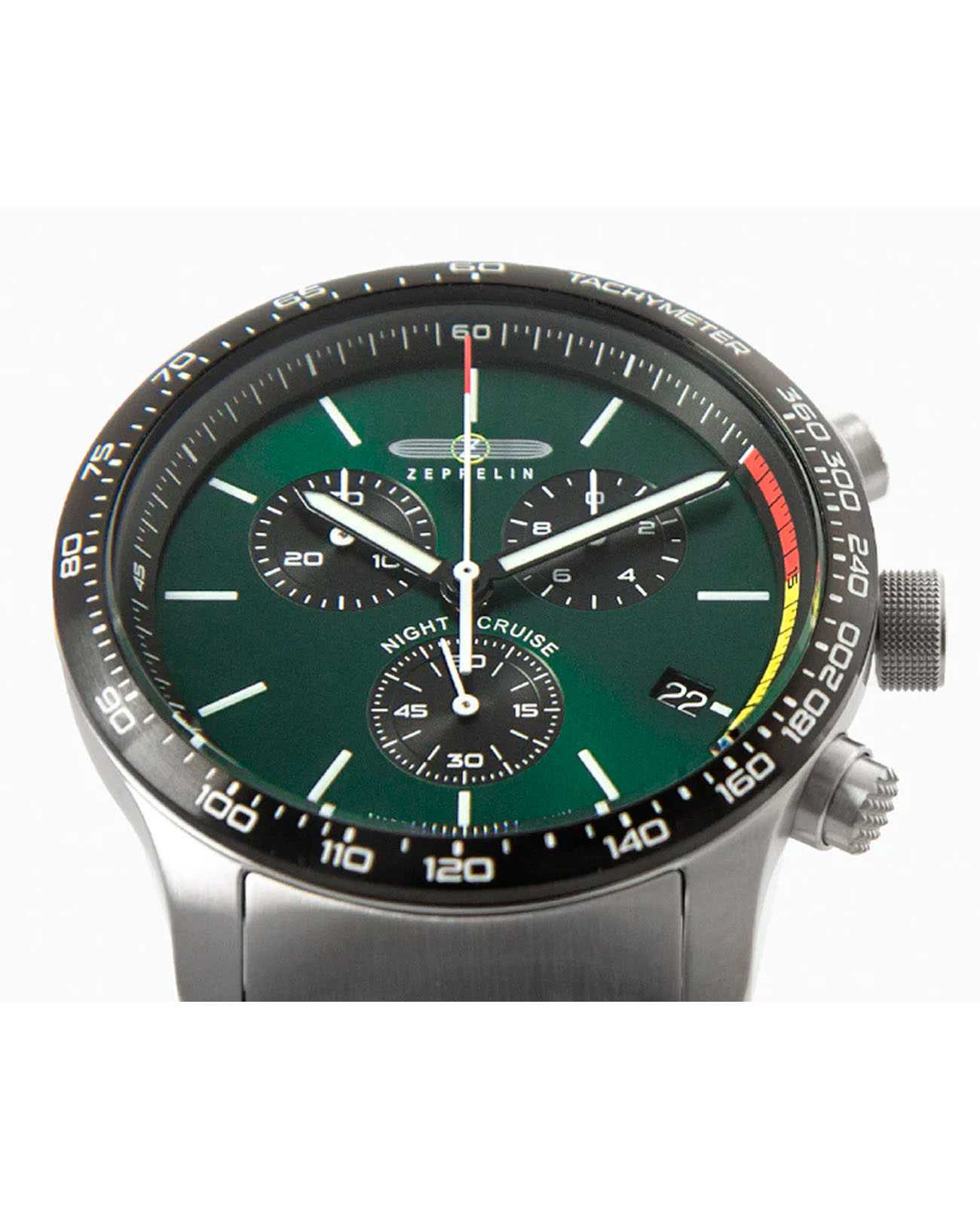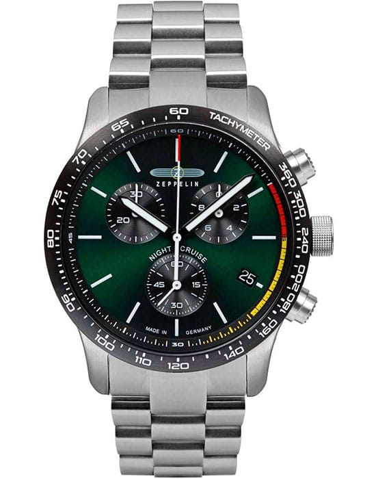 Мужские наручные часы-хронографХронографФункция позволяет измерять отрезки времени с особой точностью: часы, минуты, секунды. Верным признаком хронографа является наличие на циферблате 3 дополнительных окошек-счётчиков. Zeppelin Night Cruise 7288M4 сочетают в себе спортивный дизайн и надежность современных технологий. Модель обладает круглым корпусом диаметром 42 мм, изготовленным из нержавеющей стали с полированным/матовым покрытием, что обеспечивает высокую устойчивость к внешним воздействиям. Толщина корпуса составляет 14 мм. Браслет выполнен из нержавеющей стали с классической застежкой, гарантирующей комфортное ношение и безопасность. Зеленый циферблат оснащен шкалой с тахиметромТахиметрРазмеченная шкала, располагается на ободке или безеле часов. Тахиметр позволяет рассчитать скорость на определённом участке пути, расстояние измеряется в километрах или милях. по краю и дополнен малыми циферблатами для функций хронографа, а также окном даты на позиции «4 часов». Для защиты используется минеральное стеклоМинеральное стеклоМинеральное стекло представляет собой искусственно выращенный минерал кварца. Такое стекло отличается особой устойчивостью к повреждениям и царапинам. Уступает по некоторым качествам сапфировому стеклу. с антибликовым покрытиемАнтибликовое покрытиеСлой оксида металла в 0,13-0,3 микрон, благодаря которому стекло часов не бликует и не отражает свет. Антибликовое покрытие уменьшает отражение света в 10 раз, обеспечивая отличную читаемость показателей циферблата., обеспечивающее прочную защиту от царапин и оптимальную видимость циферблата даже при ярком свете. Часы работают на кварцевом механизме ETA G10.212, который гарантирует точное время без необходимости подзаводки. Водонепроницаемость часов достигает 10 атмосфер (100 метров), что позволяет использовать их во время плавания и других водных видов спорта, однако не рекомендуется для глубоководного дайвинга.