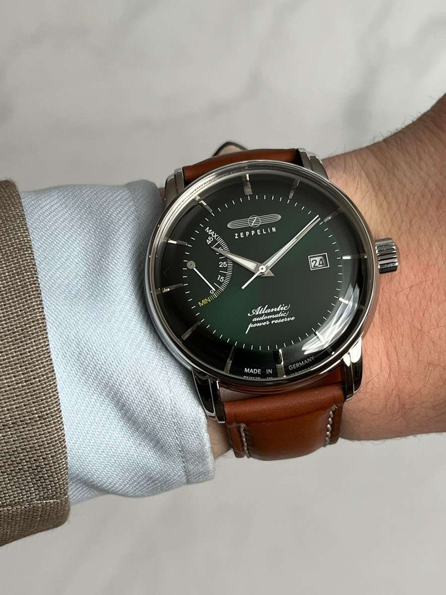 Часы Zeppelin 8462-4 — это стильные мужские часы, которые идеально подходят для мужчин, ценящих как классику, так и функциональность. Серебристый корпус из нержавеющей стали и зеленый циферблат создают элегантный и современный дизайн. Циферблат защищен закаленным минеральным стекломМинеральное стеклоМинеральное стекло представляет собой искусственно выращенный минерал кварца. Такое стекло отличается особой устойчивостью к повреждениям и царапинам. Уступает по некоторым качествам сапфировому стеклу., а индикатор запаса хода придает ему практичности. Крышка из минерального стеклаМинеральное стеклоМинеральное стекло представляет собой искусственно выращенный минерал кварца. Такое стекло отличается особой устойчивостью к повреждениям и царапинам. Уступает по некоторым качествам сапфировому стеклу. позволяет любоваться механизмом часов. Модель отличается светящимися стрелками и индексами благодаря люминесцентному покрытиюЛюминесцентное покрытиеПозволяет считывать показания времени в темноте. Производители наносят на стрелки, часовые индексы, безель или поверхность циферблата светонакопительный состав, дающий холодное свечение.. Коричневый кожаный ремешок обеспечивает комфорт и стиль, что делает эту модель идеальным выбором для любого случая. Дополнительной функцией часов является отображение дня месяца в положении "3 часа". Водонепроницаемость часов составляет 50 метров, что означает, что вы можете спокойно принимать душ, надев Zeppelin на запястье. Эти часы подойдут для повседневного ношения и станут ярким акцентом в вашем наряде.