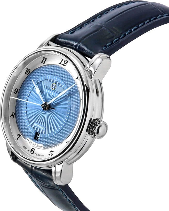 Мужские наручные автоматические часы Zeppelin ZEP-85563 из коллекции Friedrichshafen Automatic выполнены в классическом стиле и сочетают в себе высокую техническую точность с эстетикой ручной работы. Корпус круглой формы изготовлен из полированной нержавеющей стали, а характерные кольца по краю — фирменный знак часов Zeppelin, подчёркивающий их уникальность.Механизм — механический с автоподзаводом, калибр Sellita SW200 , оснащённый 26 камнями, с частотой 28 800 полуколебаний в час и запасом хода до 41 часа. Прозрачная задняя крышка позволяет наблюдать за работой механизма, что подчеркивает их техническое совершенство.Циферблат выполнен по технологии гильоше с узором Clous de Paris , центральная часть оформлена в стиле Sunray (солнечные лучи) . Метки представлены арабскими цифрами, окошко даты расположено в положении 6 часов. Цвет циферблата — голубой гильоше с серебристыми элементами, что создаёт благородный и строгий внешний вид. Стрелки часов оснащены люминесцентным покрытиемЛюминесцентное покрытиеПозволяет считывать показания времени в темноте. Производители наносят на стрелки, часовые индексы, безель или поверхность циферблата светонакопительный состав, дающий холодное свечение. для отличной читаемости в темноте.Часы оснащены плоским сапфировым стеклом сапфировое стеклоСапфировое стеклоПрочный и надёжный материал из кристалла сапфира синтетического происхождения, характеризующийся особой твёрдостью и устойчивостью к царапинам и повреждениям., устойчивым к царапинам и обеспечивающим превосходную читаемость. Заводная головка — рифлёная, из нержавеющей стали. Ремешок — из синей натуральной кожи с текстурой, имитирующей крокодилову кожу, дополнен классической застёжкой из нержавеющей стали.Водозащита — 50WR , что позволяет использовать часы в повседневных условиях без риска повреждения от случайных брызг воды. Габаритные размеры: диаметр 40 мм, толщина 11 мм, вес — 68 граммов. Это не просто аксессуар, а настоящее произведение искусства для ценителей качества, традиций и стиля.